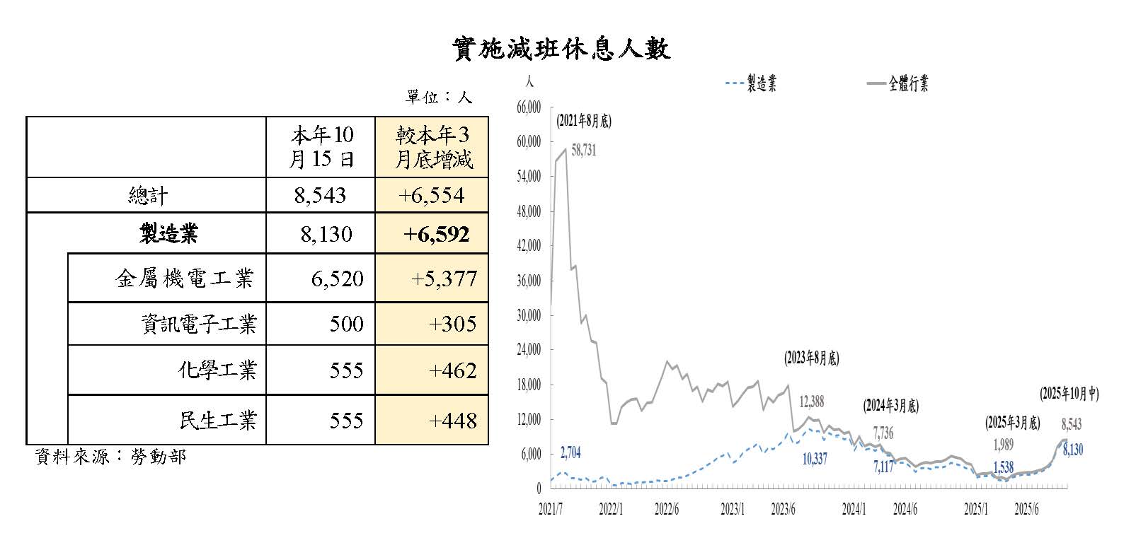 截至本年10月15日,實施減班休息之企業有432家、8,543人,係上年2月中以來新高,較本年3月底增加309家、6,554人。其中,製造業增加6,592人最多,且主要集中在金屬機電工業(增5,377人),主因美國關稅政策影響,訂單減少而實施減班休息。