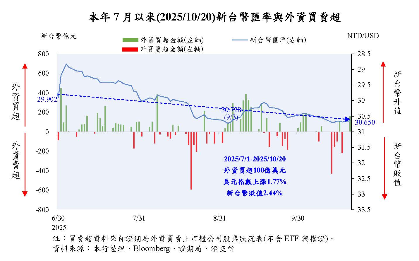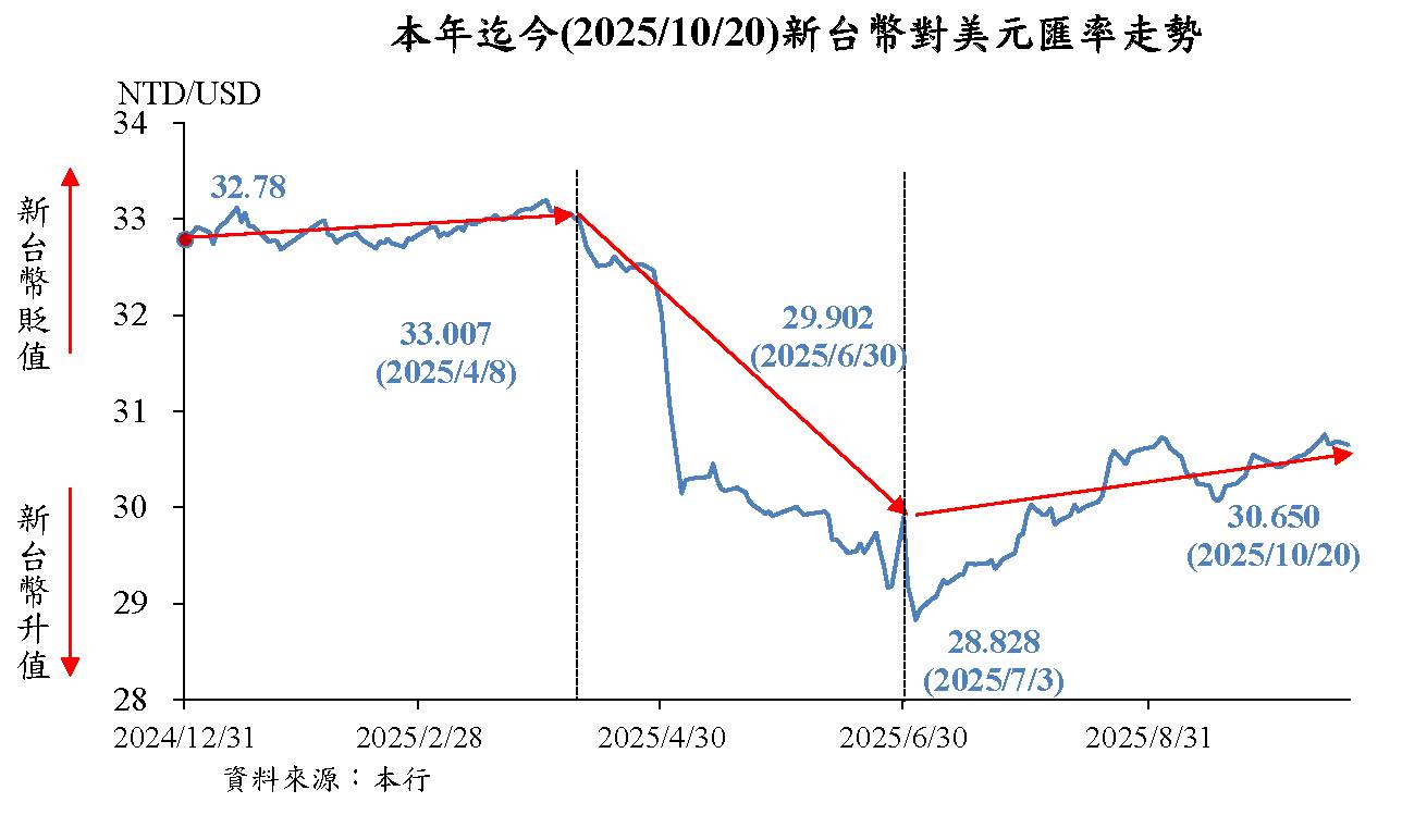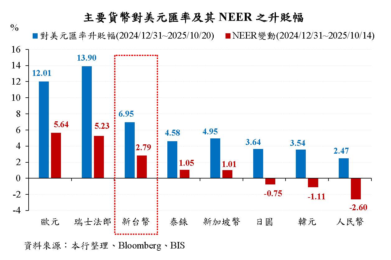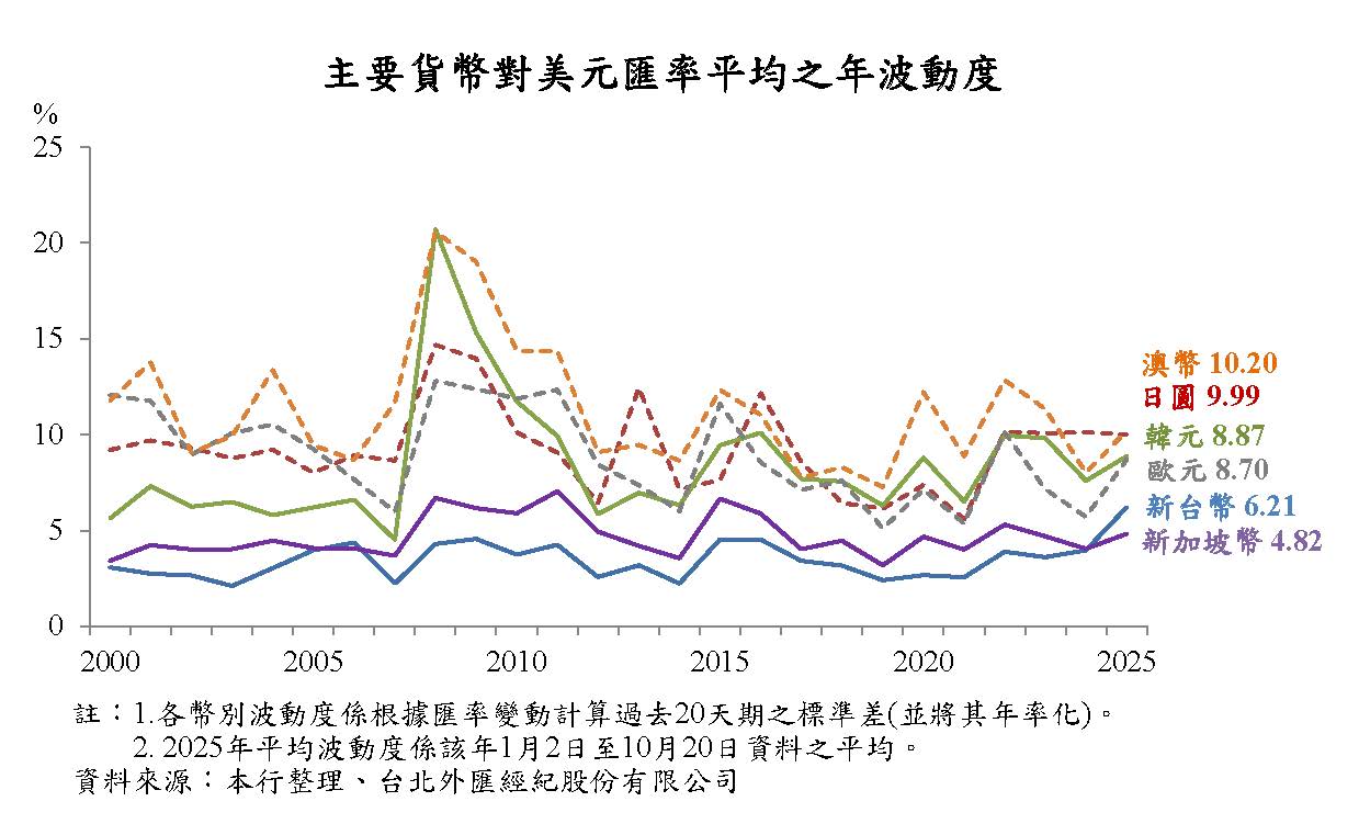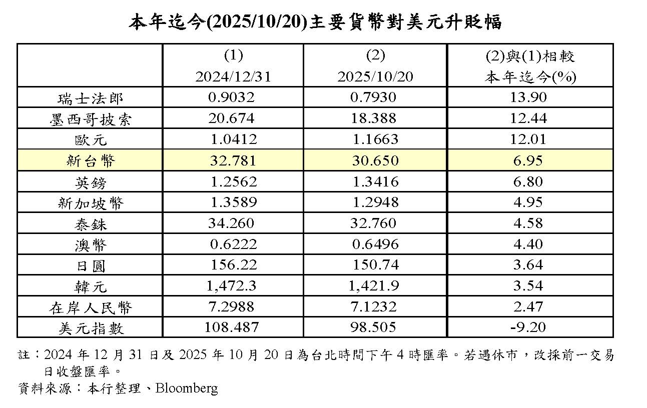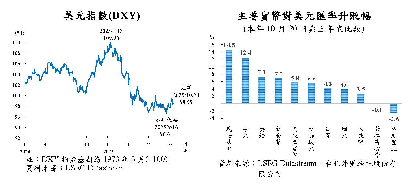 本年4月以來,美國貿易政策不確定性升高,投資人對美國經濟前景之擔憂升溫,美元指數大幅走跌,惟部分國家貿易談判有所進展,美國貿易政策不確定性下降,支撐美元指數一度走揚,嗣因市場對Fed降息之預期變化,美元指數震盪。10月20日與上年底比較,主要經濟體貨幣對美元多走升。其中,歐元因歐元區擴大財政支出支撐經濟成長,且部分國際資金重新配置流入歐元資產,加以市場解讀ECB降息週期接近尾聲,對美元升值12.4%,升幅較大;印度盧比則因美國對印度加徵50%高額關稅,恐衝擊其經濟,市場資金持續流出,對美元貶值2.6%。