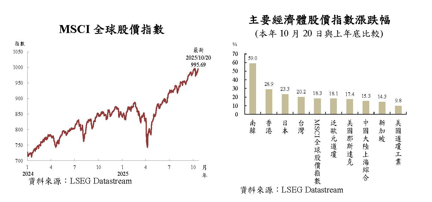 本年4月以來,美國公布對等關稅,且美中互徵高額關稅,全球股市重挫,嗣因美國延後實施對等關稅,以及美中達成暫緩互徵高額關稅協議,金融市場恐慌情緒緩和,全球股市轉漲。7月下旬以來,關稅不確定性對全球之負面衝擊趨緩,且Fed降息預期升溫推升投資人樂觀情緒,加以人工智慧(AI)浪潮持續,全球股價指數續創新高。10月20日與上年底比較,南韓股市因政府推出有利AI技術發展與強化公司治理相關政策,吸引外資持續湧入,在科技股領漲下大漲59.0%;美國那斯達克指數亦因AI基礎設施需求強勁有望帶動資本支出,以及大型科技企業財報表現亮眼,上漲17.4%。
