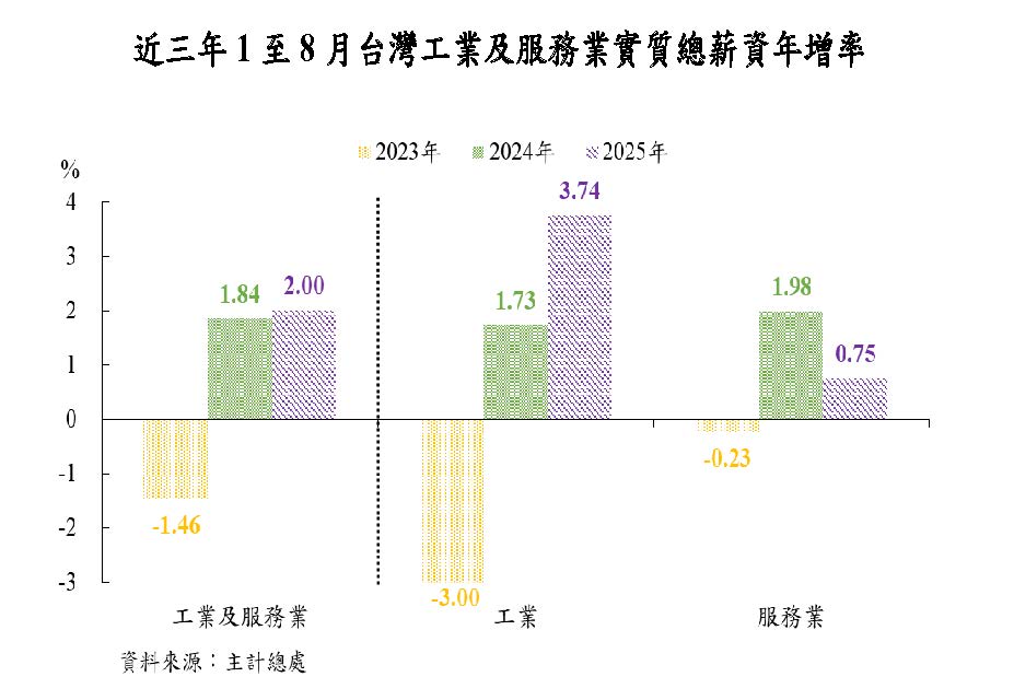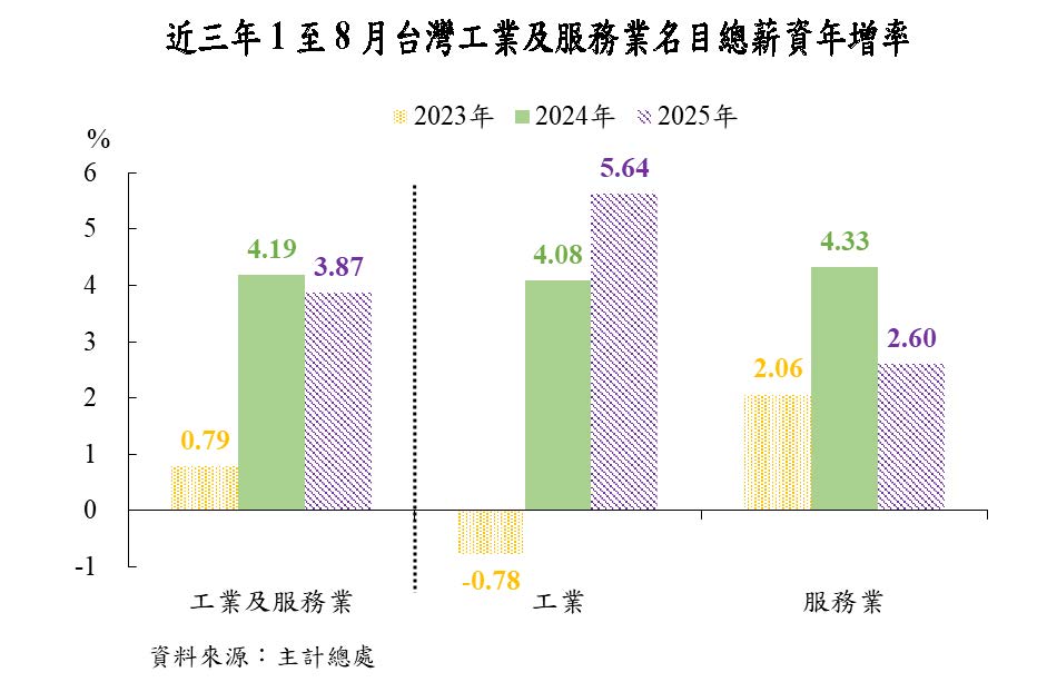 1.本年以來,工業1及服務業受僱員工名目經常性薪資溫和成長,至8月年增2.92%,總薪資年增4.38%。本年1至8月平均經常性薪資年增2.98%,增幅係2001年以來同期新高,總薪資則年增3.87%。其中,工業部門總薪資年增5.64%,高於上年同期之4.08%,主因電子資通訊產品出口持續大幅成長,帶動電子資通訊業總薪資年增8.09%,高於傳產業2之3.42%;服務業部門總薪資年增率則由上年同期之4.33%減緩至2.60%,主因不動產業轉呈年減2.90%,加以金融及保險業、支援服務業(例如旅行社業者)與住宿及餐飲業之總薪資年增率分別減緩至1.65%、1.54%與0.88%。