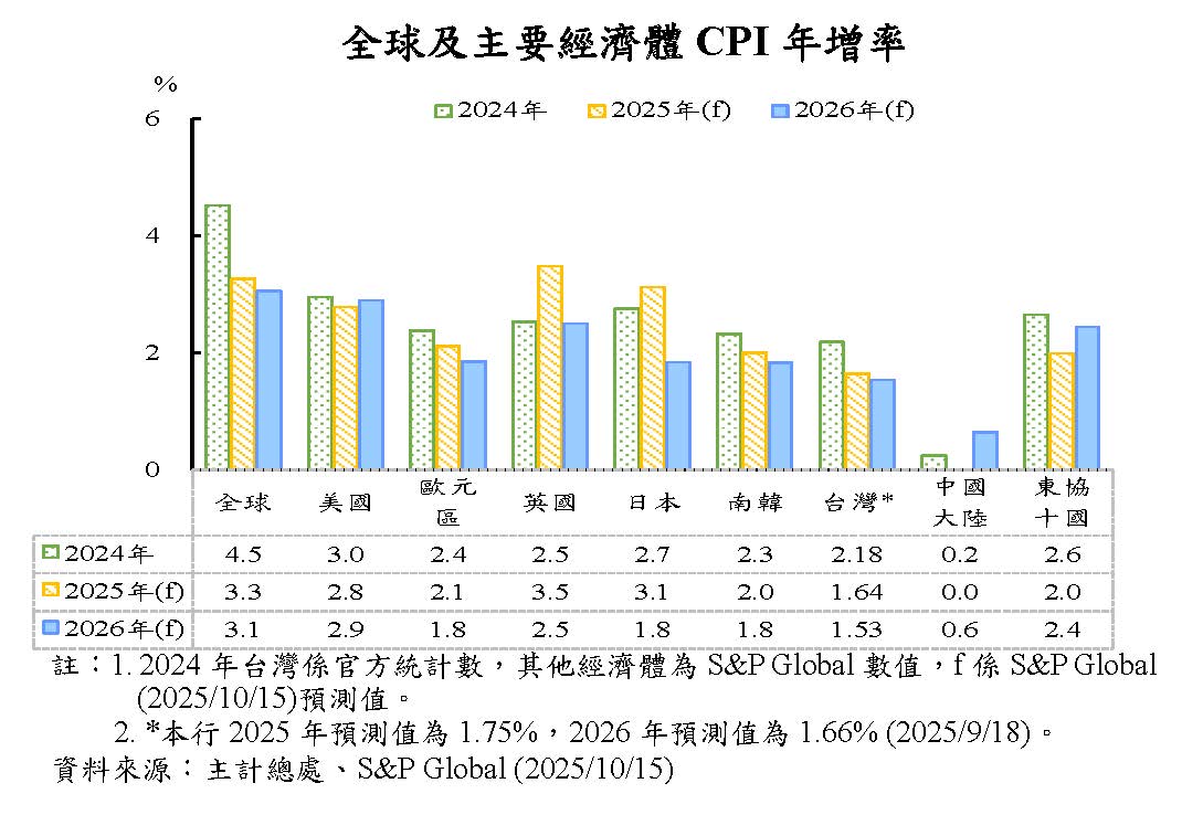 物價方面,本年全球經濟前景不確定性居高,抑制需求成長,加以原油等國際大宗商品價格走低,預期全球通膨率續降。除美國受關稅影響致通膨有上行壓力外,歐元區等主要經濟體通膨率走低。S&P Global預測本年全球通膨率由上年之4.5%降至3.3%,明年續降至3.1%。