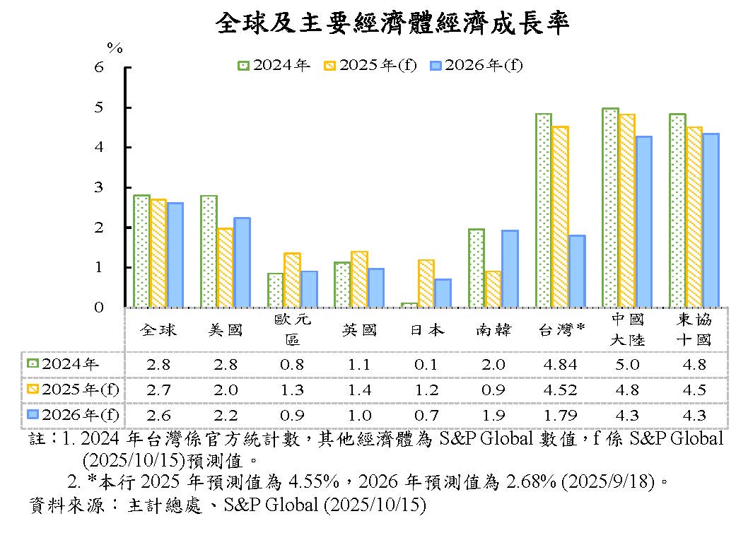本(2025)年4月以來,美國對各國對等關稅稅率雖初步確定,惟對等關稅及芬太尼關稅面臨合法性爭議,加以近期美中貿易戰再次升溫衝擊市場,全球經濟前景變數仍多,S&P Global Market Intelligence(以下簡稱S&P Global)預期本年全球經濟成長率為2.7%,略低於上(2024)年之2.8%,明(2026)年全球經濟成長率續降至2.6%。