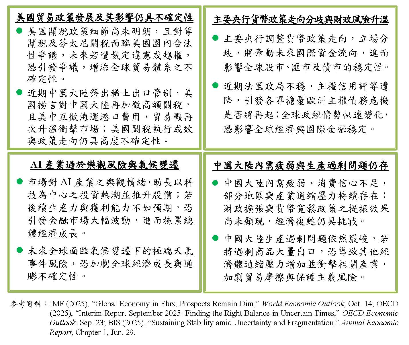 本年全球經濟成長與通膨趨緩,經濟前景面臨美國貿易政策發展及其影響仍具不確定性、主要央行貨幣政策走向分歧與財政風險升溫、AI過於樂觀風險與氣候變遷、中國大陸內需疲弱與生產過剩問題仍存等諸多不確定因素,仍需持續關注後續發展及影響。