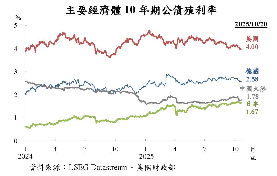 本年4月初,美國公布之對等關稅稅率高於預期,美、德、日、中之10年期公債殖利率均大幅下滑,嗣因美國延後實施對等關稅,惟財政惡化隱憂升溫,美國10年期公債殖利率走高,帶動德、日10年期公債殖利率回升。7月以來,Fed降息預期升溫,美國10年公債殖利率轉趨走跌,德國大規模財政支出計畫持續對其公債殖利率形成上行壓力,中國大陸因資金由債市轉往股市,公債殖利率由低點回升,然近期受美中貿易爭端再起,德、中10年期公債殖利率隨美債回跌,日本經濟成長優於預期,BoJ維持升息立場,市場預期新任首相將採擴張財政政策,日本10年公債殖利率續升。