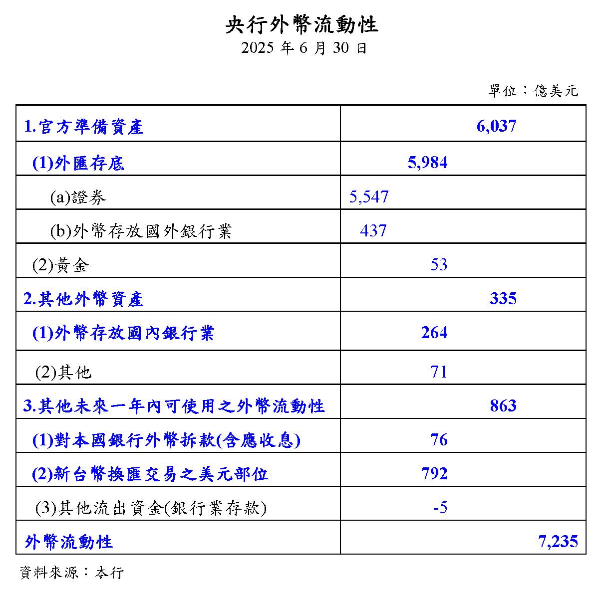 賴清德總統於今年5月20日就職周年談話中宣布,政府將成立主權基金,打造國家級投資平台,以強化台灣在全球經濟變局中的競爭力,並強調「當前正是理想時刻」。總裁您也多次指出,主權基金的資金來源不宜直接動用外匯存底,建議可由財政部發債、撥款或出資設立。但本席認為,以現階段來看,外匯存底仍是最具可行性的短期財源。我國外匯存底截至9月底已達6,029億美元,首度突破6,000億大關,創歷史新高。請問總裁,若以外匯存底作為主權基金的初期籌資來源,您認為安全界線應控制在多少比例?此外,台灣主權基金的規模若要兼顧穩健與效益,您認為理想規模應是多少?