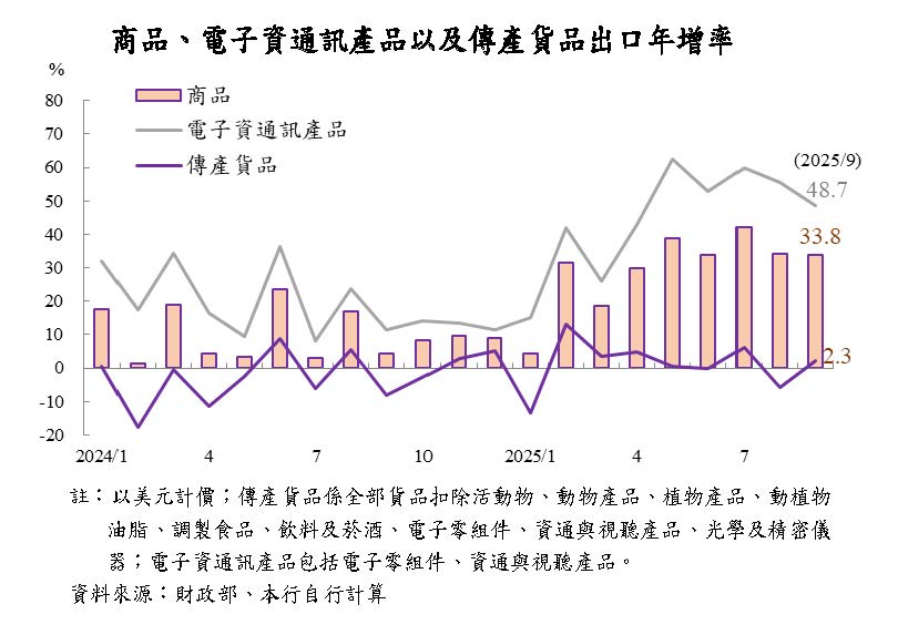 ─本年9月電子資通訊產品出口成長48.7%,推動商品出口成長33.8%;傳產貨品出口則僅成長2.3%。本年1至9月商品出口成長29.7%,其中,電子資通訊產品出口成長45.3%,傳統貨品出口則僅成長0.8%。