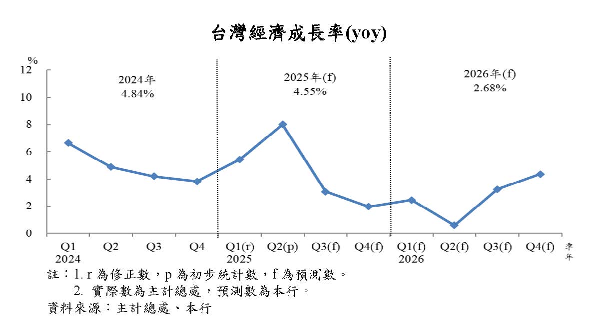 2.展望下半年,預期AI需求續熱絡,維繫台灣輸出成長力道,並增添投資動能,惟上年下半年民間投資基期較高,且民間消費受美國關稅措施不確定性影響而動能平緩,預期下半年經濟成長率降為2.51%,全年則為4.55%。