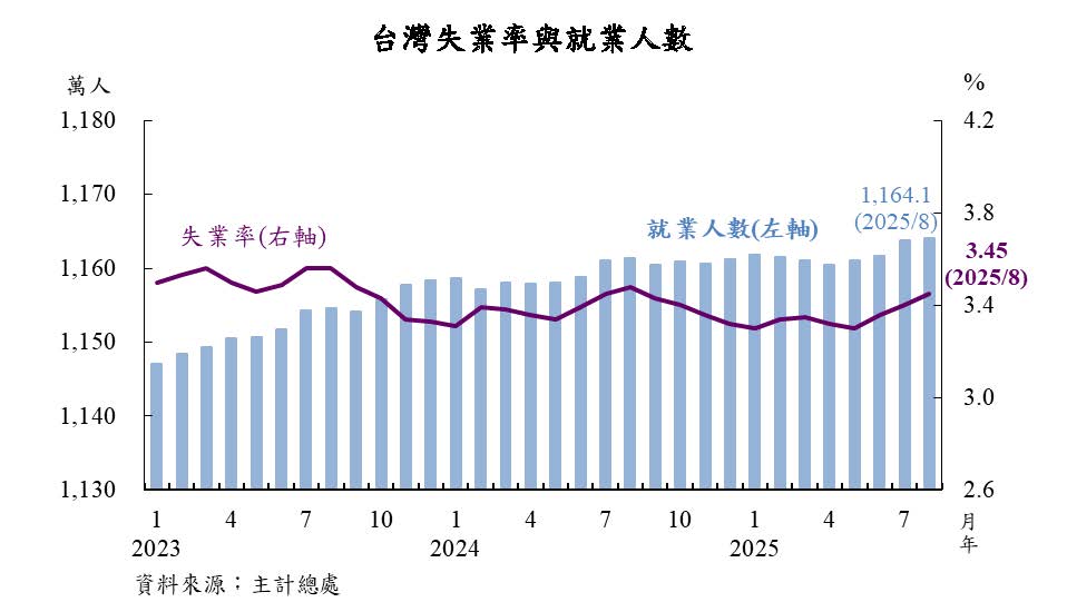 本年以來,國內勞動市場續呈穩定,5月失業率降至3.30%;6月起,受部分應屆畢業生或暑期工讀生投入尋職之季節性因素影響,失業率回升,至8月為3.45%,惟較上年同月下降0.03個百分點,且係2001年以來同月最低。8月就業人數為1,164.1萬人,年增0.24%。