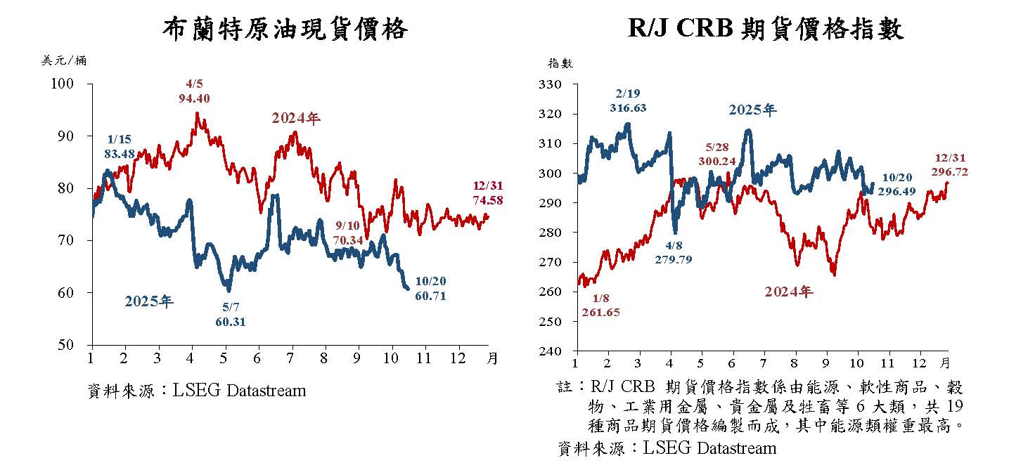 本年4月以來,美國貿易政策恐衝擊全球經濟,油價走低;嗣因美國暫緩對等關稅措施,油價止跌,惟中東戰爭干擾,油價低檔震盪。7月以來,美國就業數據不佳,加以OPEC+持續增產,造成供給過剩擔憂,油價下修。9月下旬以來,OPCE+持續增產,且美中貿易戰擔憂再起,油價轉跌。其他大宗商品部分,整體金屬價格因市場預期美國將持續降息而上漲,穀物價格則因產量持續增加而走跌,代表整體國際大宗商品價格之R/J CRB期貨價格指數大致隨原油價格走勢轉跌。
