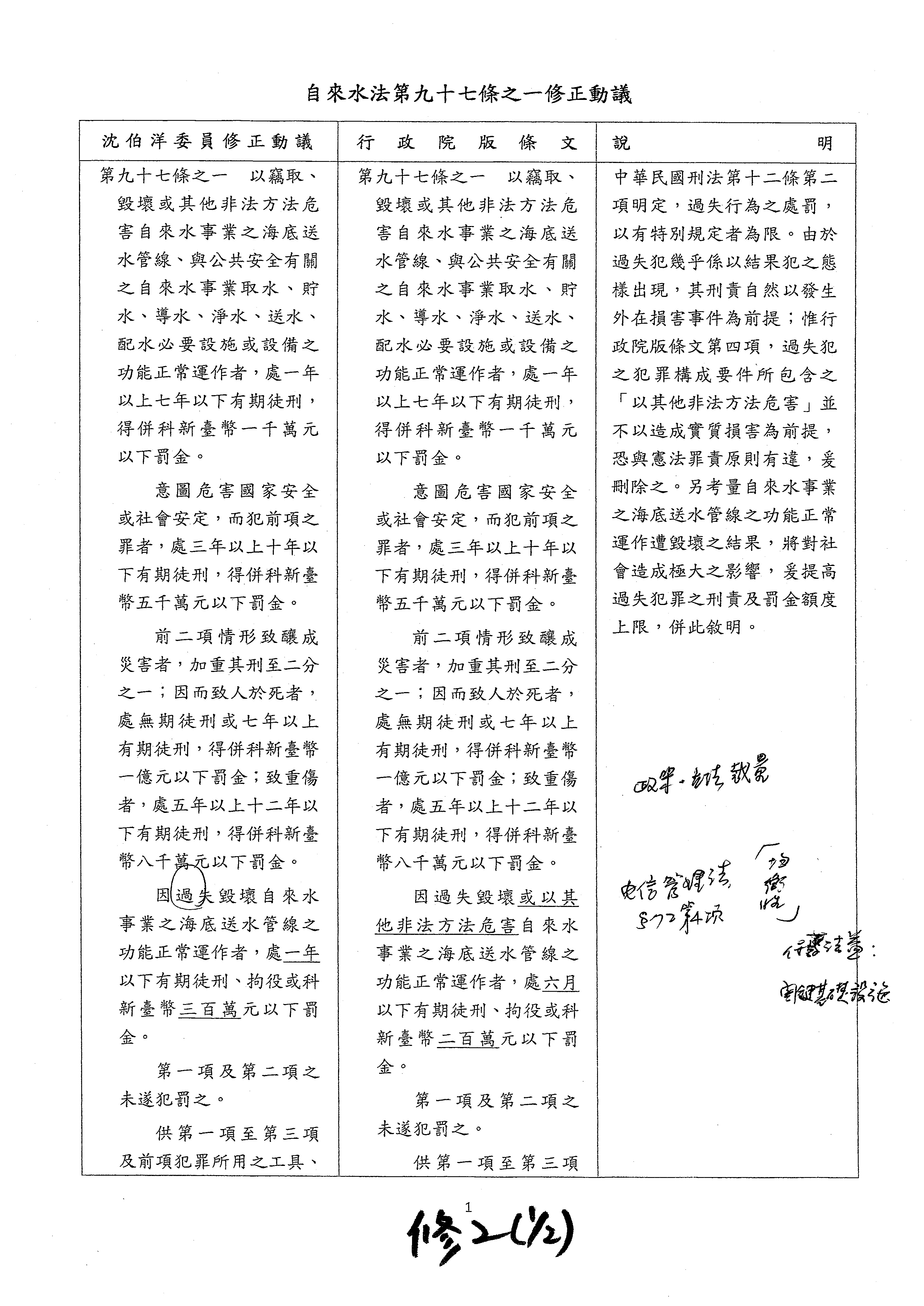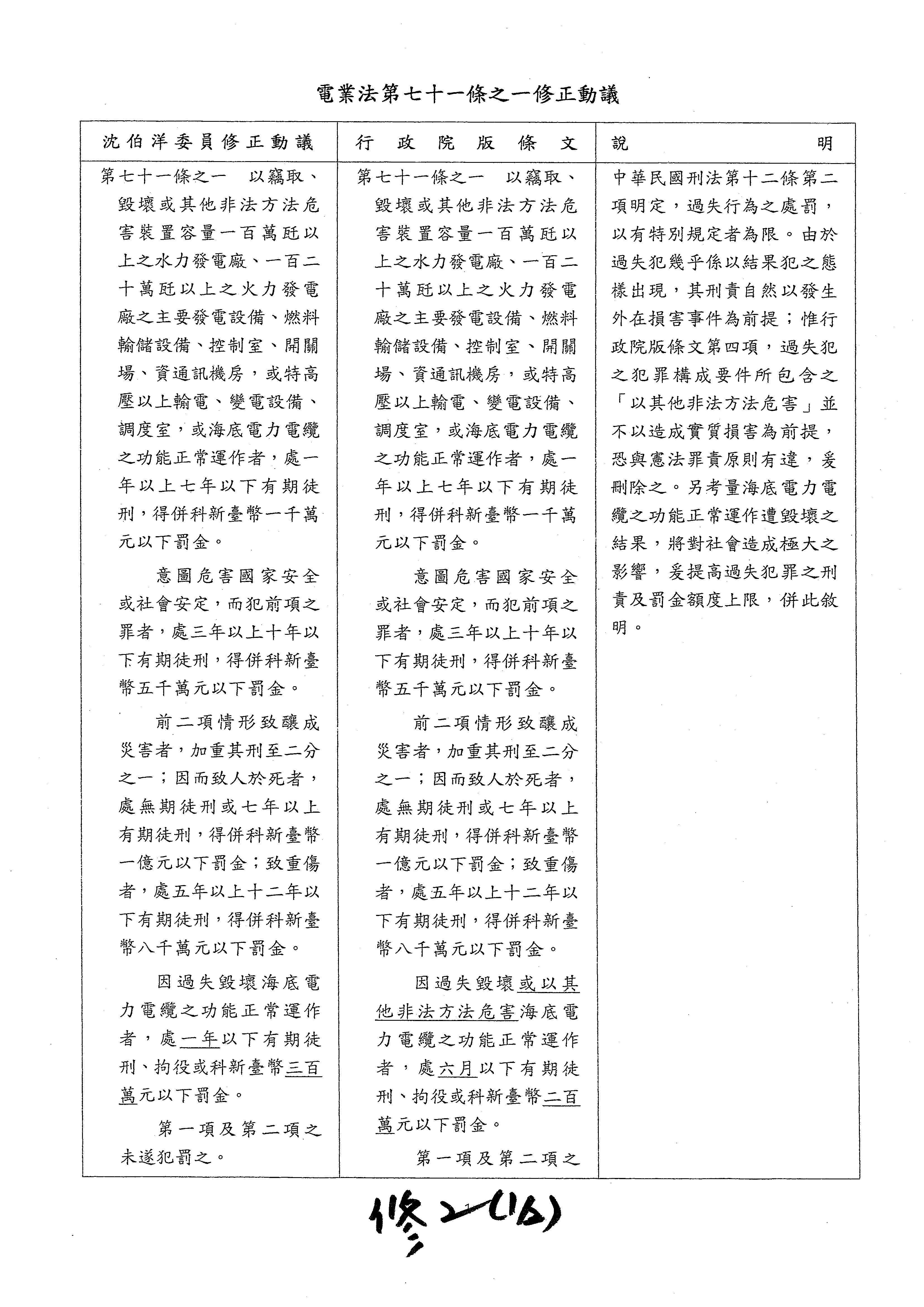 沈委員伯洋:好,我再附帶做個說明。剛剛也有跟法務部在討論,就法律的設計上,故意跟過失的刑度有差距是常見的,但是因為今天海纜這部分真的是比較特別一點,就是一旦不能夠證明故意的話,大部分都會落入到過失犯,所以如果它中間有差距的話會比較不容易達到嚇阻的效果。但是,如果今天不是要一年以下的話,像剛剛楊委員也有提到300萬以下的罰金,其實我覺得這是可以考慮的做法。我覺得當然第一線的執法單位有他們自己的一些意見,因為過失的範圍很廣,各式各樣的過失都有,而且很多是我們自己漁民的過失,但我覺得這個還是應該要納入考慮。以上。謝謝。
