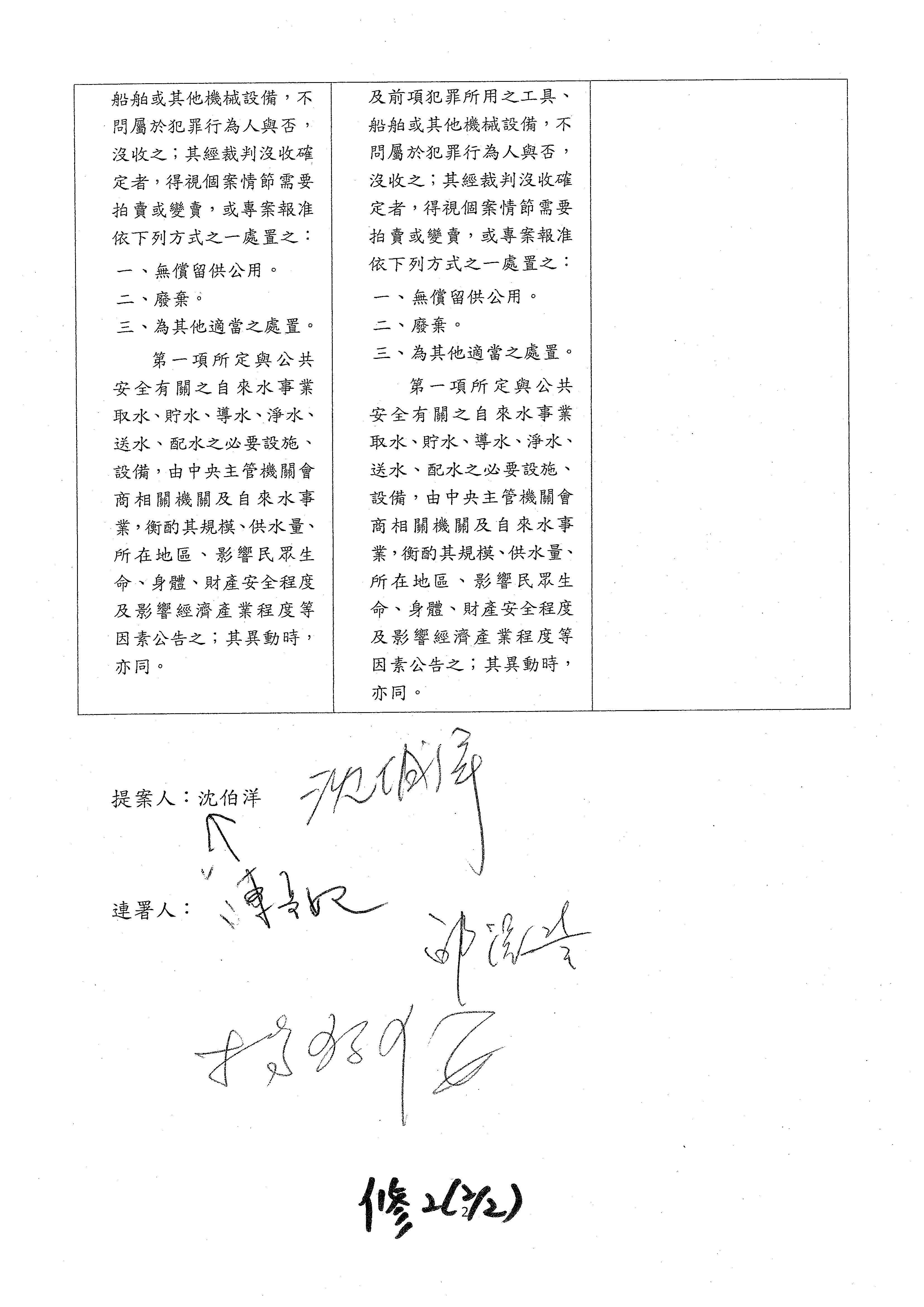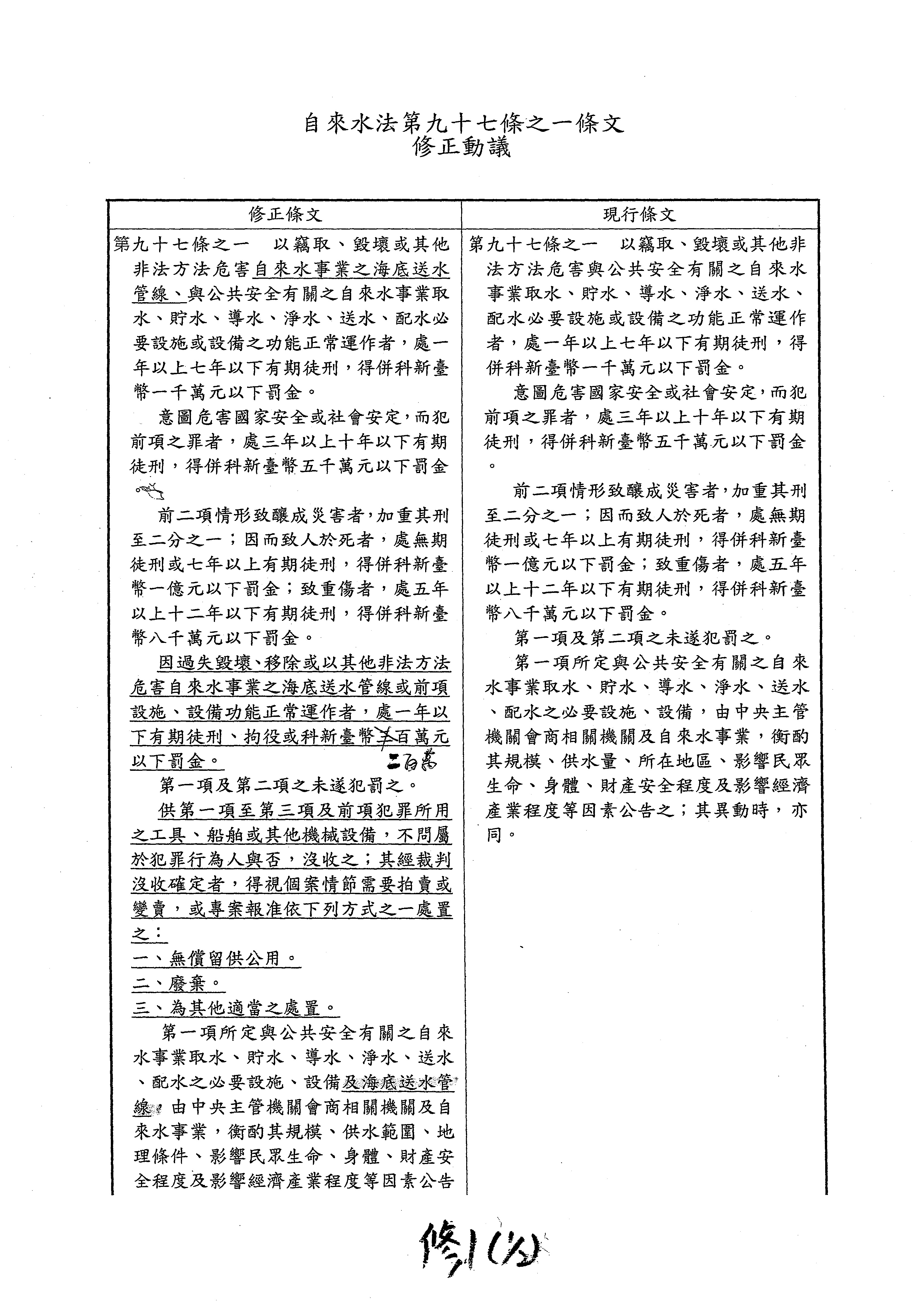 (二)本院委員王美惠等19人擬具「自來水法第九十七條之一條文修正草案」案。