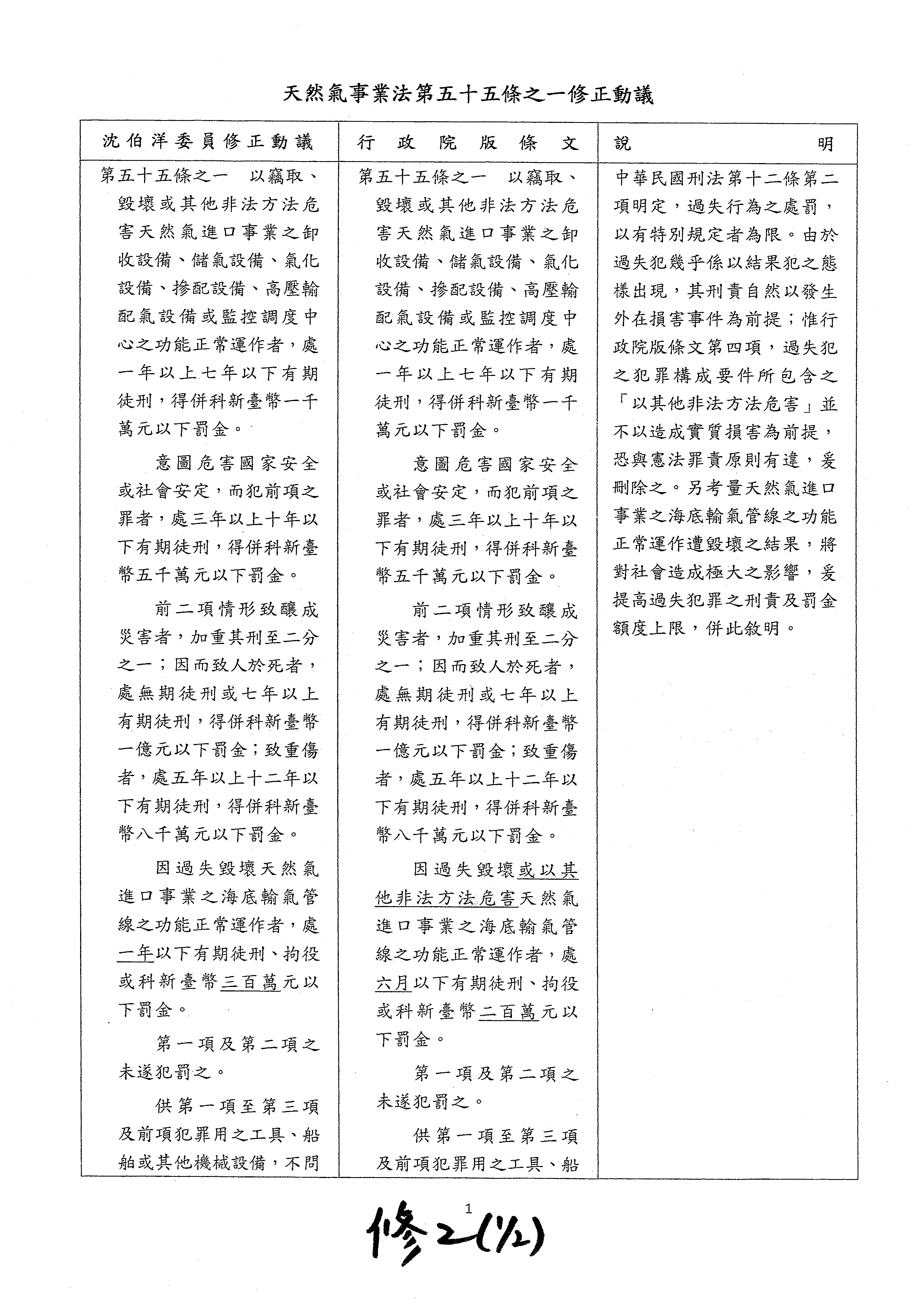 (二)本院委員王美惠等20人擬具「天然氣事業法第五十五條之一條文修正草案」案。