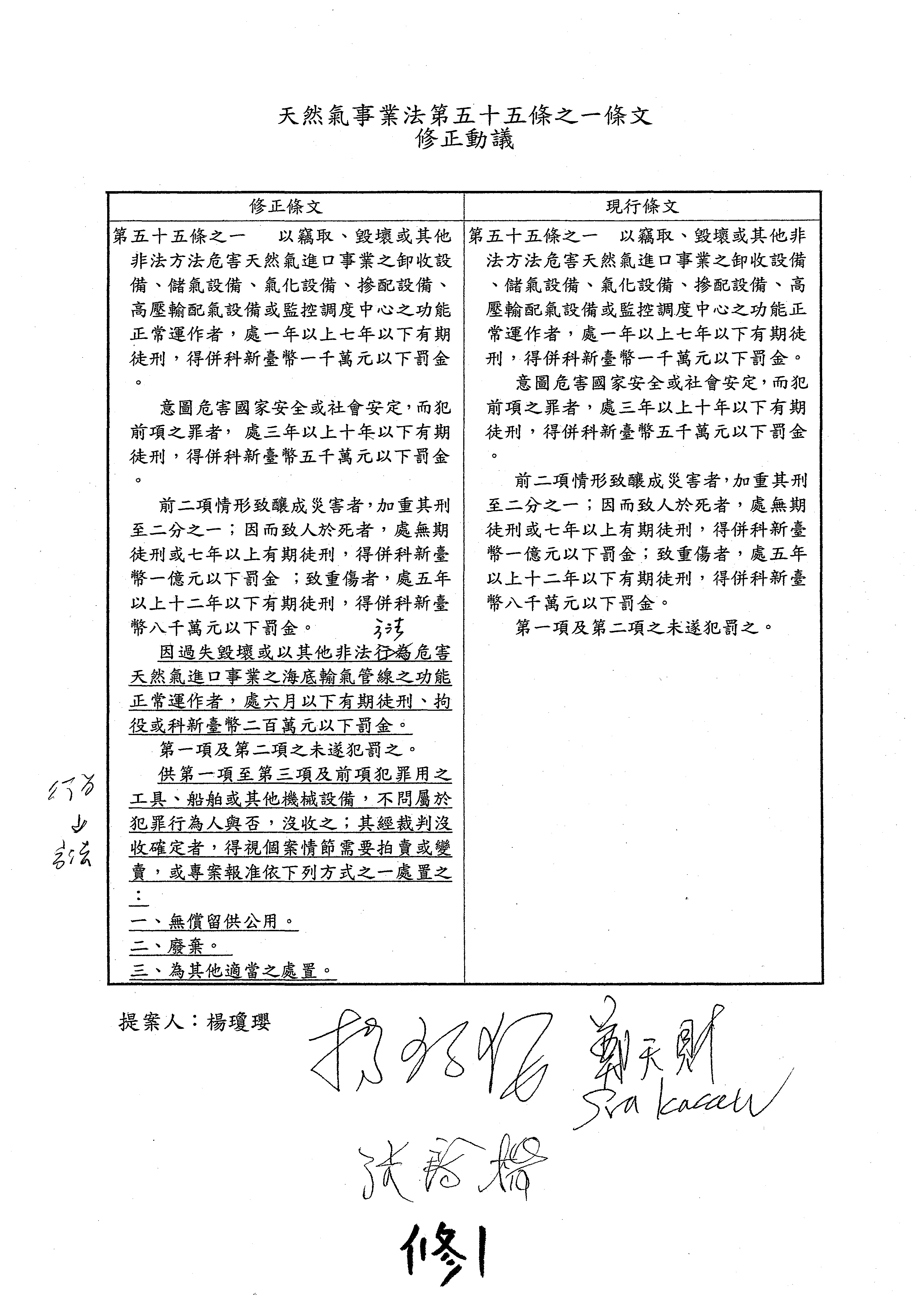 (九)本院委員陳亭妃等17人擬具「天然氣事業法第五十五條之一條文修正草案」案。