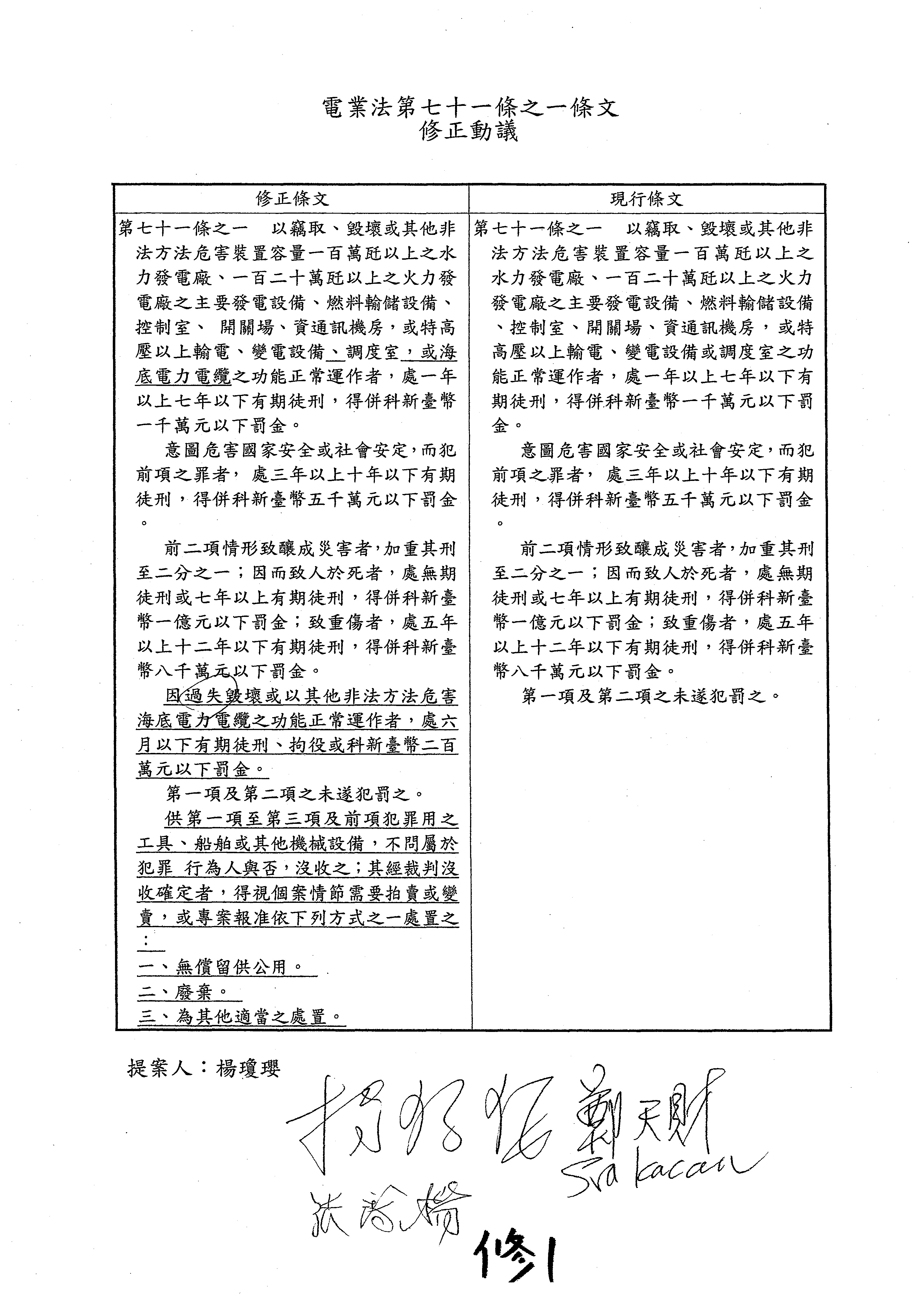 楊委員瓊瓔:電業法的部分,就針對電業法第七十一條之一的部分,這個沒有問題啊,本席的提案,你們同意這些文字嘛?