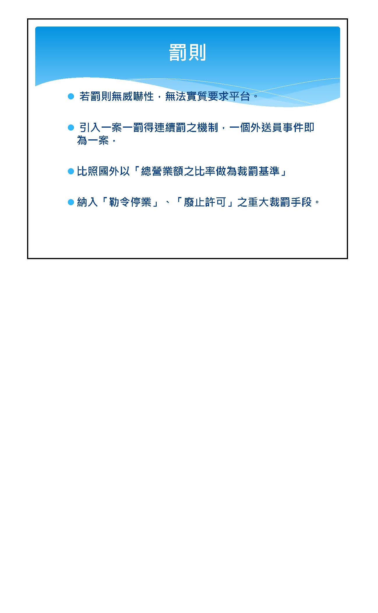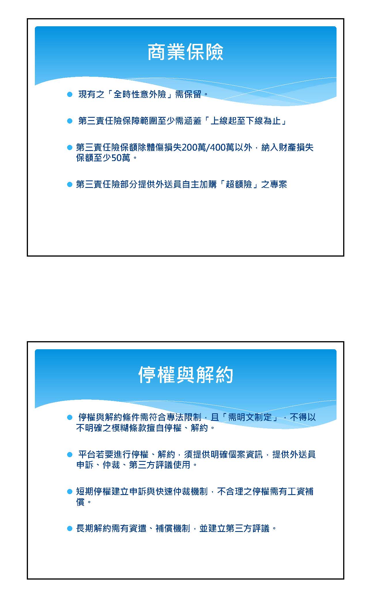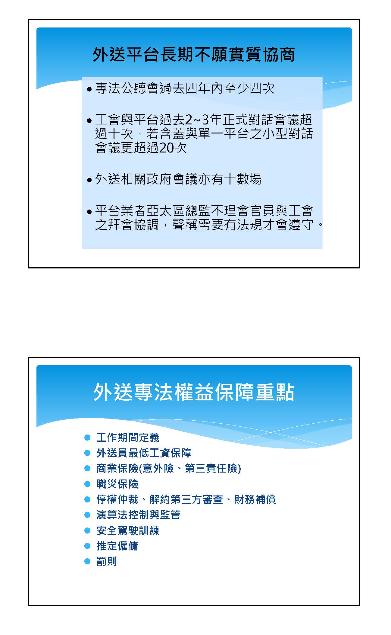 其次,終止契約確實沒有錯,今天很多工會提到,這也是在我們平臺上討論了非常多次,但是確實很可惜,就是平臺業者對這件事情一直始終都很保留。這一次我們也要特別強調,特別是對終止契約這個部分我們非常非常在意,因為在終止契約以後,他真的就沒有工作了,如果這是他的專職工作,對他來講就等同沒有收入來源。所以我們特別對終止契約部分做了強化,我們預計規劃有違反六個重大法律,而且要情節重大才可以終止契約。我們也希望公司要設立一個獨立超然小組,我們要保護消費者沒有錯,但是一定要有一個獨立超然的內部小組審議,對於外送員也會比較公平,這是我們特別針對工作權的部分。