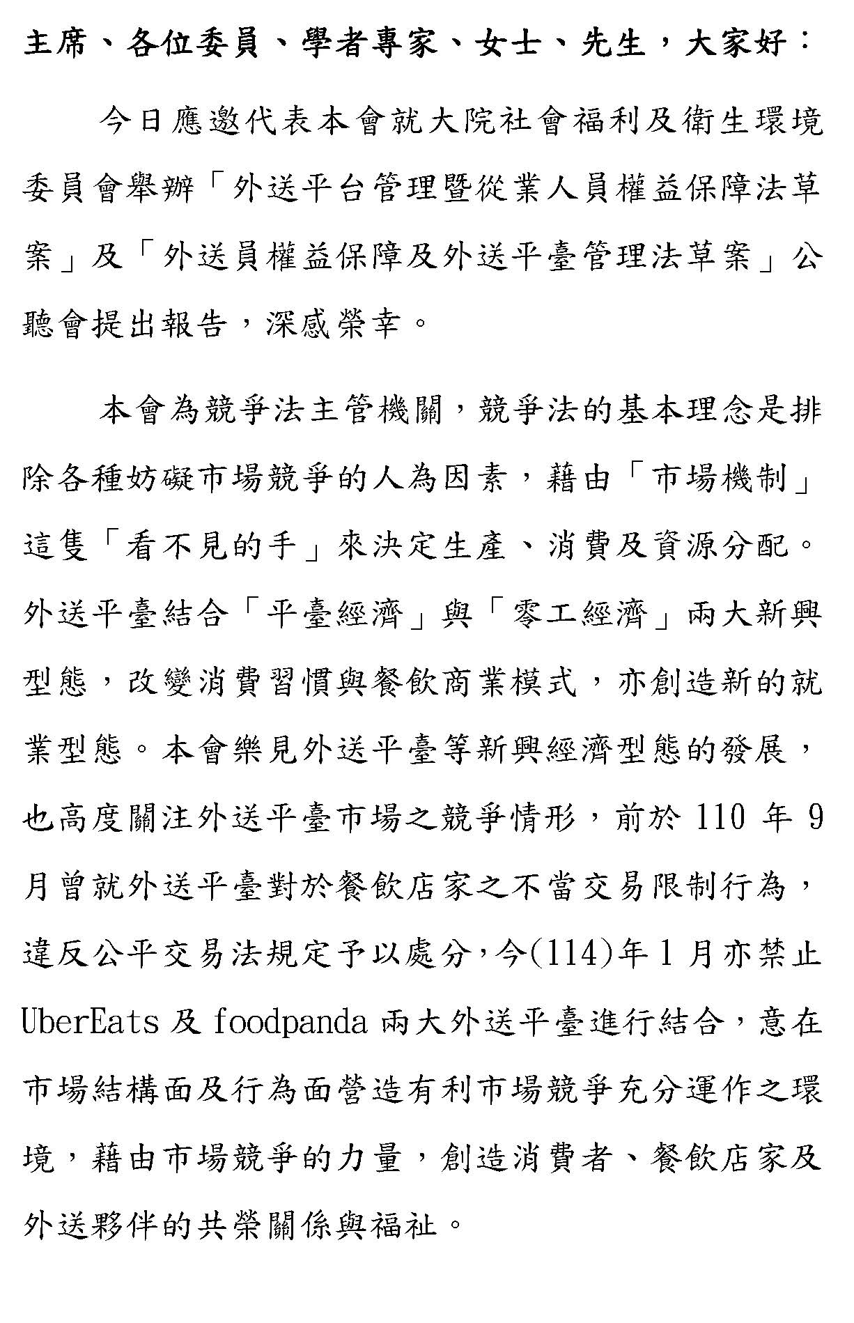 今天本會舉行「外送平台管理暨從業人員權益保障法草案」及「外送員權益保障及外送平臺管理法草案」公聽會,謝謝各位學者專家及各政府的機關代表蒞臨指教。本次公聽會探討的議題以提綱為準,請自行參閱。
