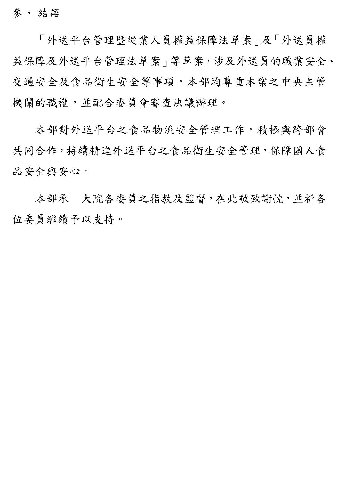 我最後想要說的事情是,的確很多人會認為外送專法過去醞釀的時間真的比較久,會期待它更快速。勞動部會用最積極的態度,我在這邊可以跟大家保證,我們會用最積極的態度,提出相關的這些……不管是版本,或者是剛剛大家其實還是有一些地方的爭議需要釐清,或者是需要拿出一套解決方法的作法,我們會用最積極的態度處理這個問題。但的確因為這個專法涉及到的利害相關方很多,所以我們也覺得要讓這裡面有更完整的審議空間。剛剛有幾位委員說我們需要更多的社會對話,如果現在勞動部跟大家說需要更多社會對話,可能就會有人說你是不是又不想要審了?你是不是又只想要讓大家停留在對話的過程?沒有!我們不是只想讓大家停留在對話的過程,我覺得我們勢必要再積極審議。積極審議、釐清問題,甚至在這些問題裡面找到合理的解決方案,讓這個解決方案能夠進入法條的保障裡面,我們會用這個態度處理問題。所以很謝謝大院,也包括委員會,願意給我們這個機會,我們會盡我們所能,儘量尋找各方之間權益上面的平衡,尤其是外送員。剛剛大家聽下來就很清楚,其實外送員在過去的過程裡面,在權益上面的確是最需要進一步保障的,可是這裡面不是只有外送員,還有包括剛剛講到的消費者、店家,甚至也會有一些專業資訊是從平臺業者提供,這些事情我們都聽到了。接下來,我們會有很多需要一起合作的地方,我們會積極的跟大家溝通,包括協商,包括有一些處理問題的方案,怎麼樣可以得到最多的平衡,而且能夠解決最大部分的問題。以上,謝謝。