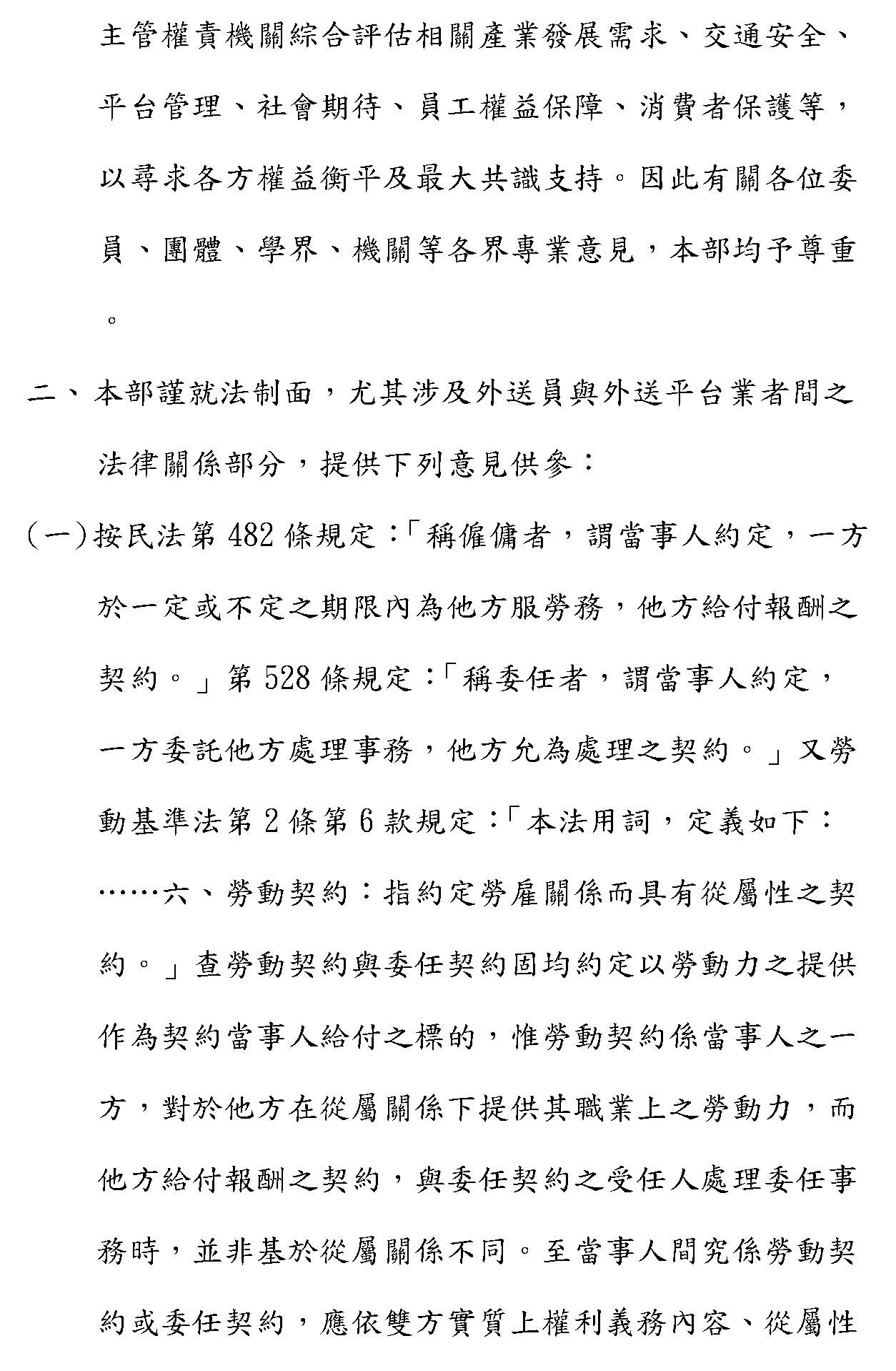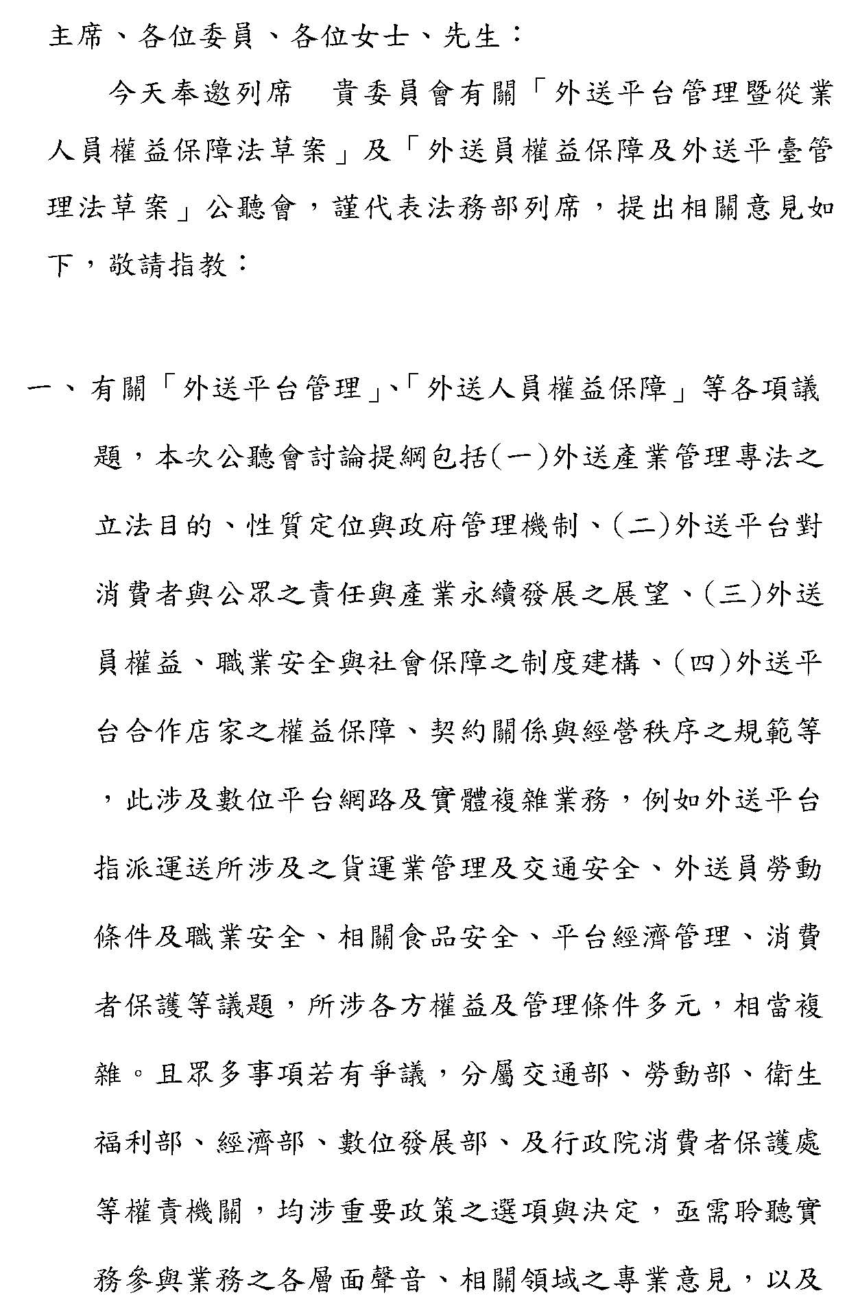 汪參事南均:主席、各位委員、各位女士先生,謹代表法務部回應。外送平臺管理、外送人員權益保障的各項議題涉及數位平臺網路及實體的業務,所涉各方權益及管理條件多元,也相當複雜,如果有爭議,其實是分屬交通部、勞動部、衛生福利部、經濟部、數位發展部、行政院消費者保護處等權責機關,都是涉及重要政策的選項及決定,所以聆聽實務參與業務各層面的聲音及相關領域的專業意見,對於未來的修法非常關鍵,主管權責機關當然必須配合並綜合評估,尋求各方的權益衡平及最大的共識支持。因此,各位委員、團體、學界、機關等各界的專業意見,本部都予尊重,謹就法制面,尤其是涉及外送員跟外送平臺業者之間的法律關係部分,本部提供以下的意見供參考。