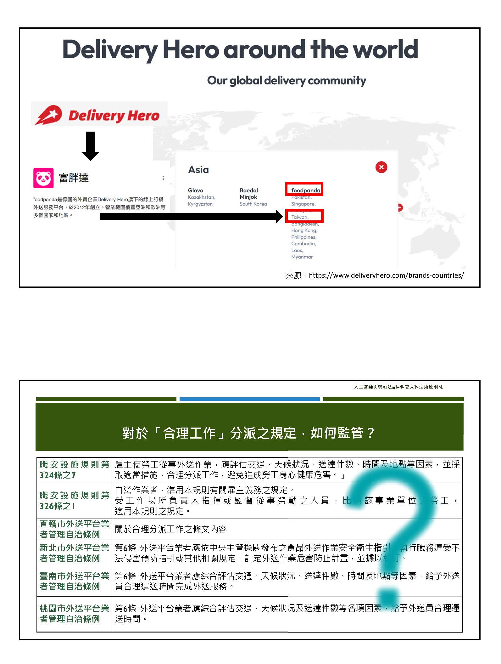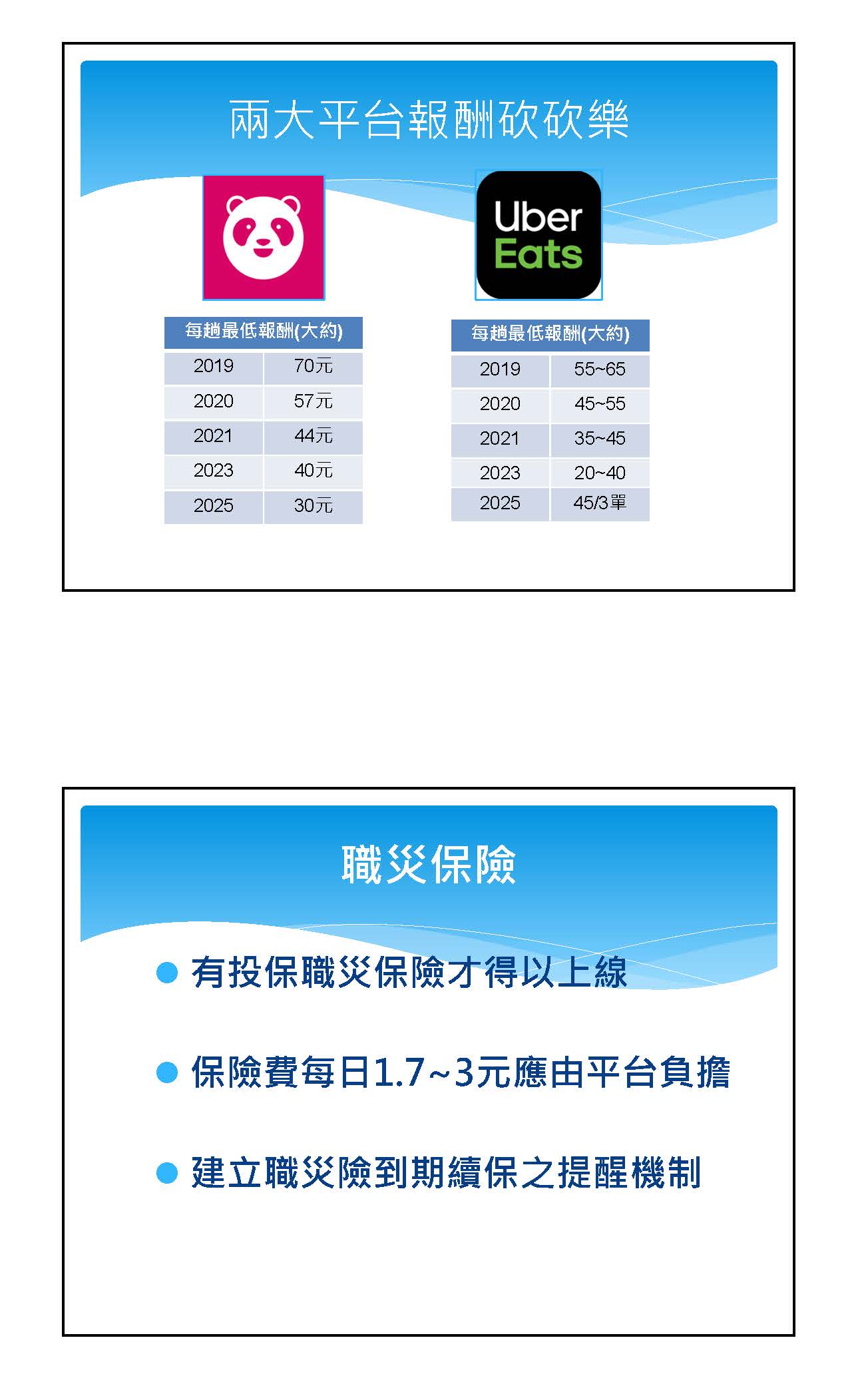 當然我們也注意到一件事情,在目前法制上面,反而地方自治條例走的速度比我們的專法來得快,以至於在這種情況之下,各縣市管理也不一樣,在這種情形之下,確實需要有一部專法來釐清各方的權益。在過往跟勞動部的討論也認為,在解決法律關係之前,我們先兼顧各方的權益,平臺的控制力應該要適當地調整,除了申訴之外,我看到黨團的版本有申訴制度、有外部人的參與,我覺得這個事情可以平衡單方的內容之外,從平臺控制的這件事情,或許也可以參考我們在過去有人體審查委員會,他是做什麼事情的呢?因為做的事情都比較是屬於倫理審查的事項,所以我們希望有外部專家的參與,來監管平臺管理有沒有過度苛責勞動者的立場。在這種情形之下,我們會覺得除了有申訴委員會的機制,或許在內部也可以建立內部的自我審查機制,但是有外部人的參與,能夠兼顧到平臺以及勞動者權益的部分。當然有一個很重要的需求是來自於職災,確實如果從目前勞保的立場來看,他是被定義成一個自營作業者的立場,在自營作業者的立場來看,目前是沒有提供職災保險。如果我們用專法把他納進去成為類職災保險的情況之下,一定程度會讓現在商業保險的成本能夠下降,也可以跟職災保險銜接。但是可能會延伸出一個問題,因為自營作業者其實不是只有所謂的外送員,其他產業的自營作業者,例如一些廚師或其他各類職業工會,也可能會有職災保險的需求,整體的負擔我們是不是能夠去承擔,這或許也是一個可以考慮的點。但是有專法,至少不會用現在商業保險的費率來增加各方的權責,因為你加到平臺上,平臺就一定會轉嫁到外送員這邊。我們要適當地平衡,也希望透過專法的方式考量。