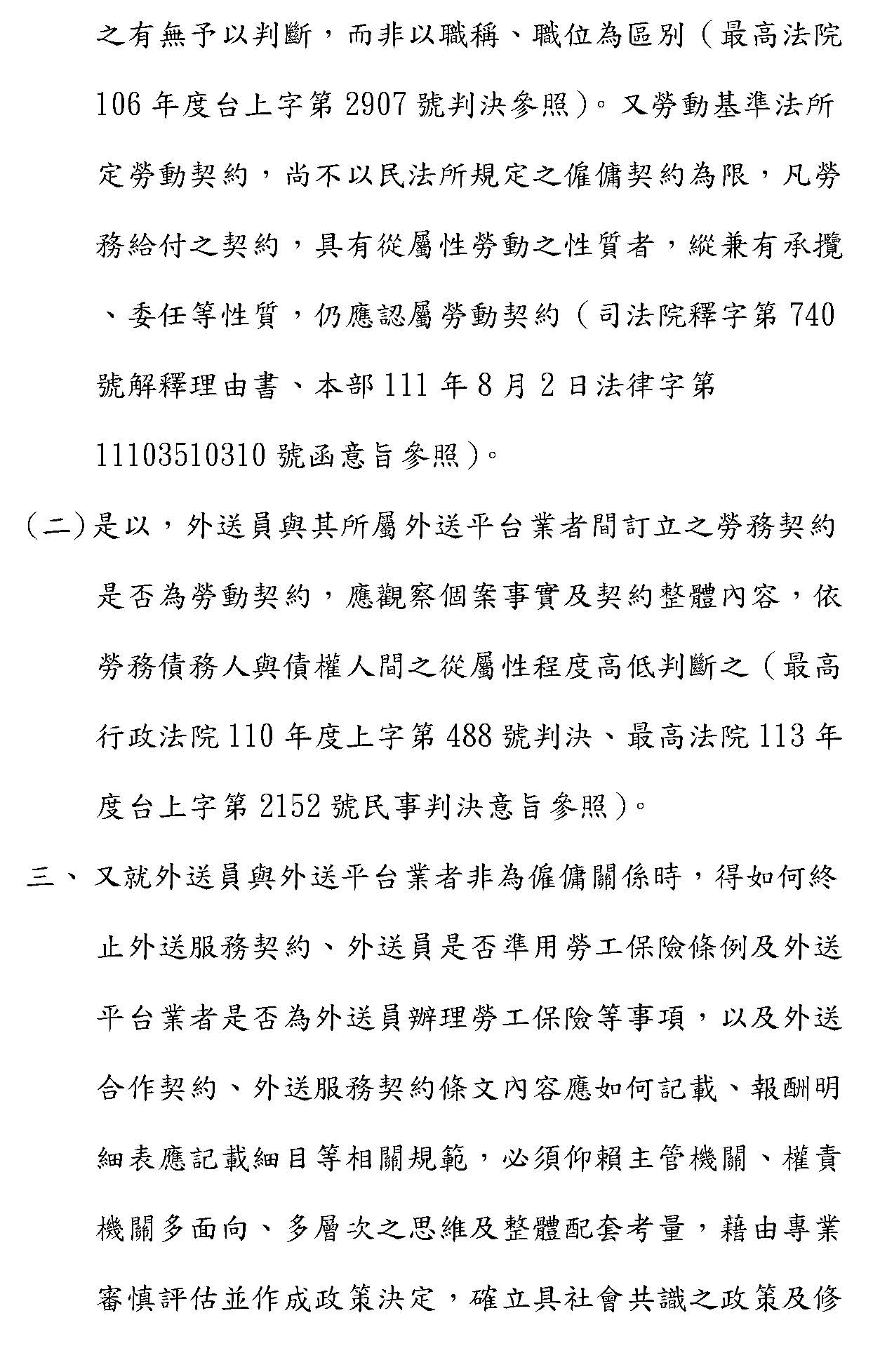 勞動基準法所規定的勞動契約是指約定勞雇關係而具有從屬性的契約,所以勞動基準法所定勞動契約不以民法所規定的僱傭契約為限,只要勞務給付契約具有從屬性、勞動性質,縱使兼有承攬或者委任性質,仍然應該屬於勞動契約,司法院大法官會議解釋、法院的判決及本部過往的函釋都有一致的見解。所以外送員與其所屬外送平臺業者之間訂立的勞務契約是否屬勞動契約,而能夠依照適用勞動基準法相關規定加以保障,要觀察個案事實及契約整體內容,目前是這樣,就是以這樣的勞務債務人跟債權人之間的從屬性程度高低來判斷。