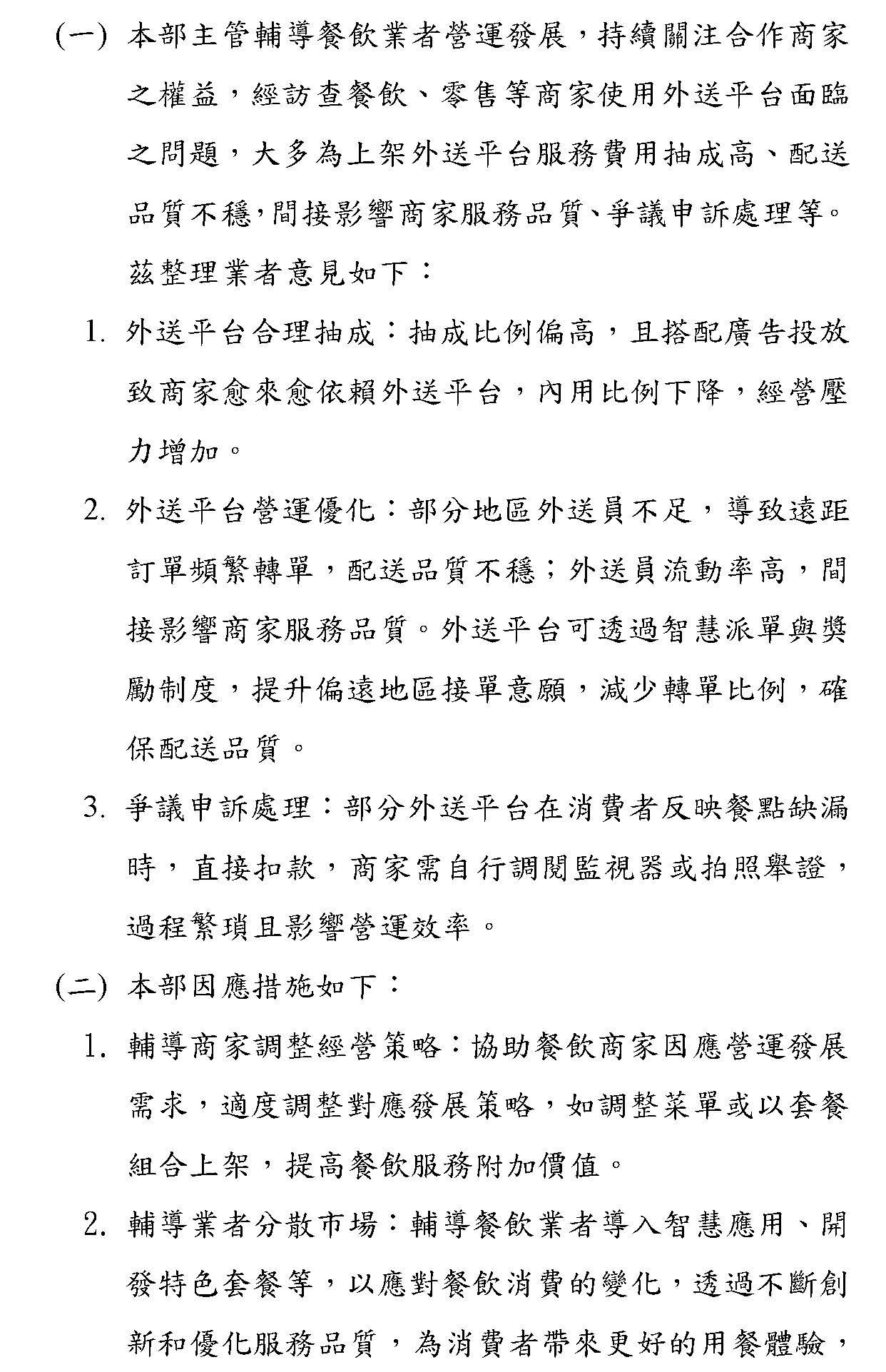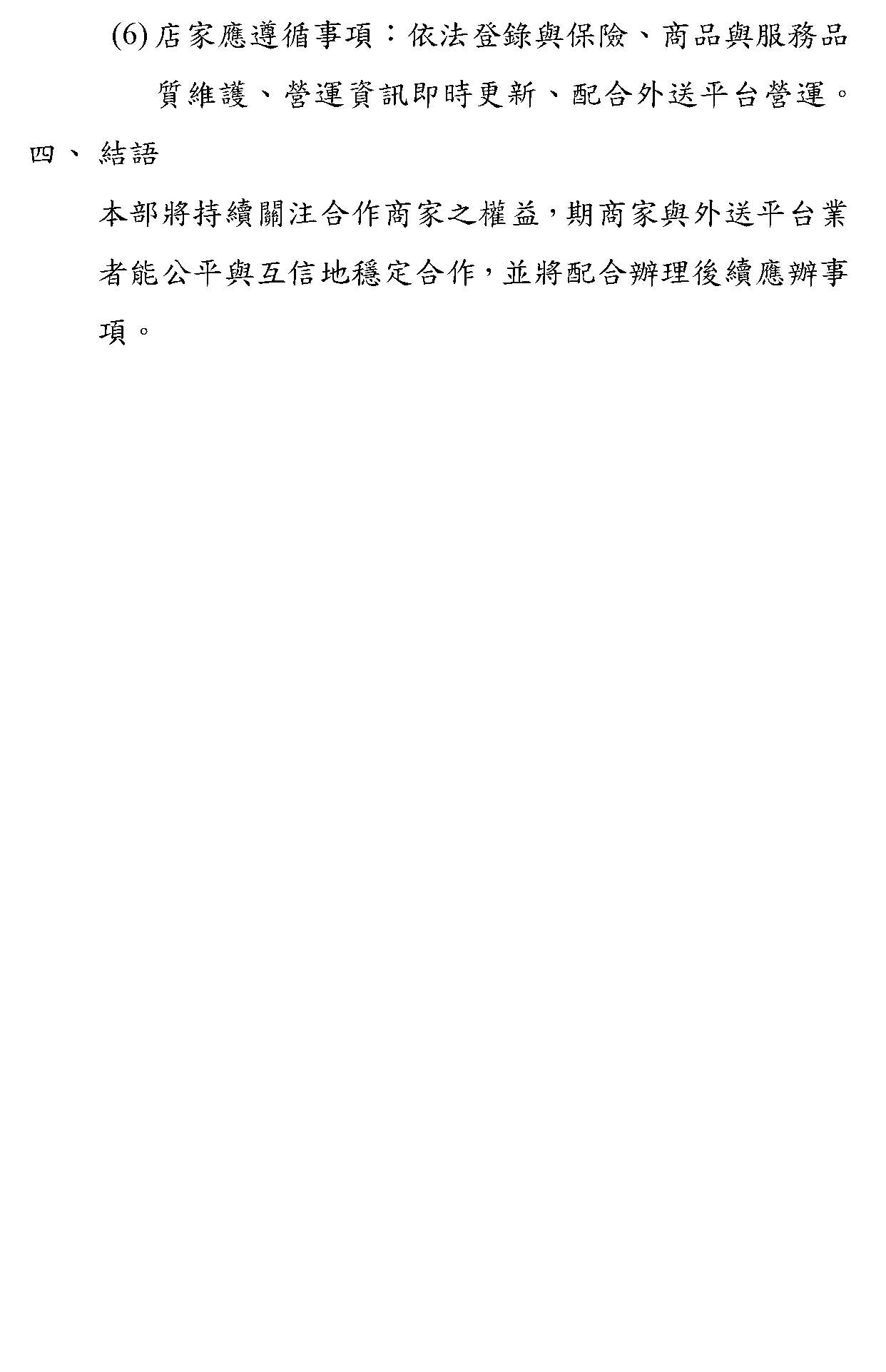 李組長勇毅:主席、各位與會專家學者,大家好。經濟部作為輔導餐飲業及零售業發展的主管機關,為了使合作商家和平臺業者可以在公平互信的基礎上面穩定合作,同時兼顧合作商家的經營自主和合理的利潤,本部會訂定外送服務的契約範本,促使合作商家跟外送平臺中間有穩定、健全的發展。以上。