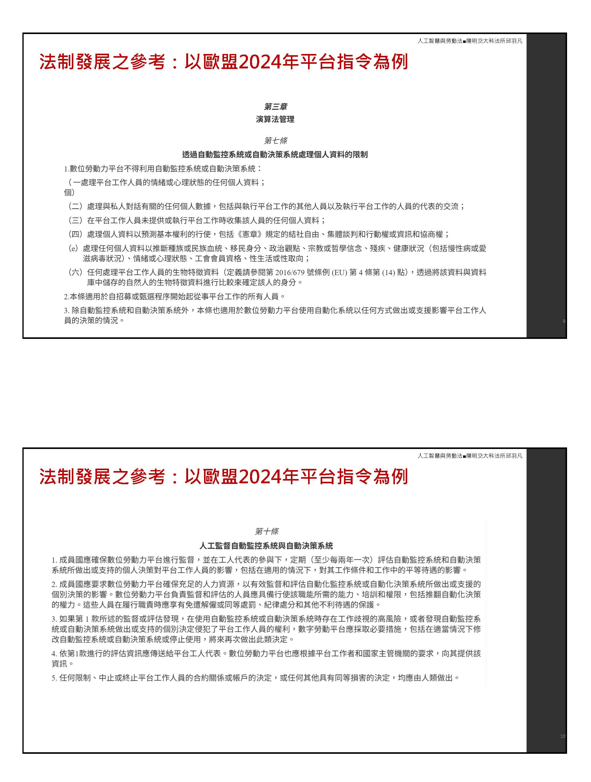 另外一個情況是,目前對於外送員來講,我們應該可以從工作權的保障,或許也從另外一個觀點叫工作權的保護來看這件事情,畢竟他跟傳統的僱傭關係不一樣,所以保障這些事情,畢竟還是要跟僱傭關係區隔之外,另外一個情況,從保護的機制裡面,我們就會希望從外部申訴,不要任意給他終止,從工作權保護的立場來看,給予他一些機會,讓他不會一次就斷線。當然也有一個情況,會不會有過度爭取業務的人,造成有些叫超強的外送員,可是他可能也造成自己不管是在身體,或者是在職災或交通上的危險。這個過度勞動或許也可以在這部專法裡面怎麼去考慮,在勞動者的立場來看,我們有過勞的議題,可是在外送員的情況之下,似乎沒有人去顧慮這方面的情形,這也是我們在專法裡面可以去權衡考慮的。以上,謝謝。