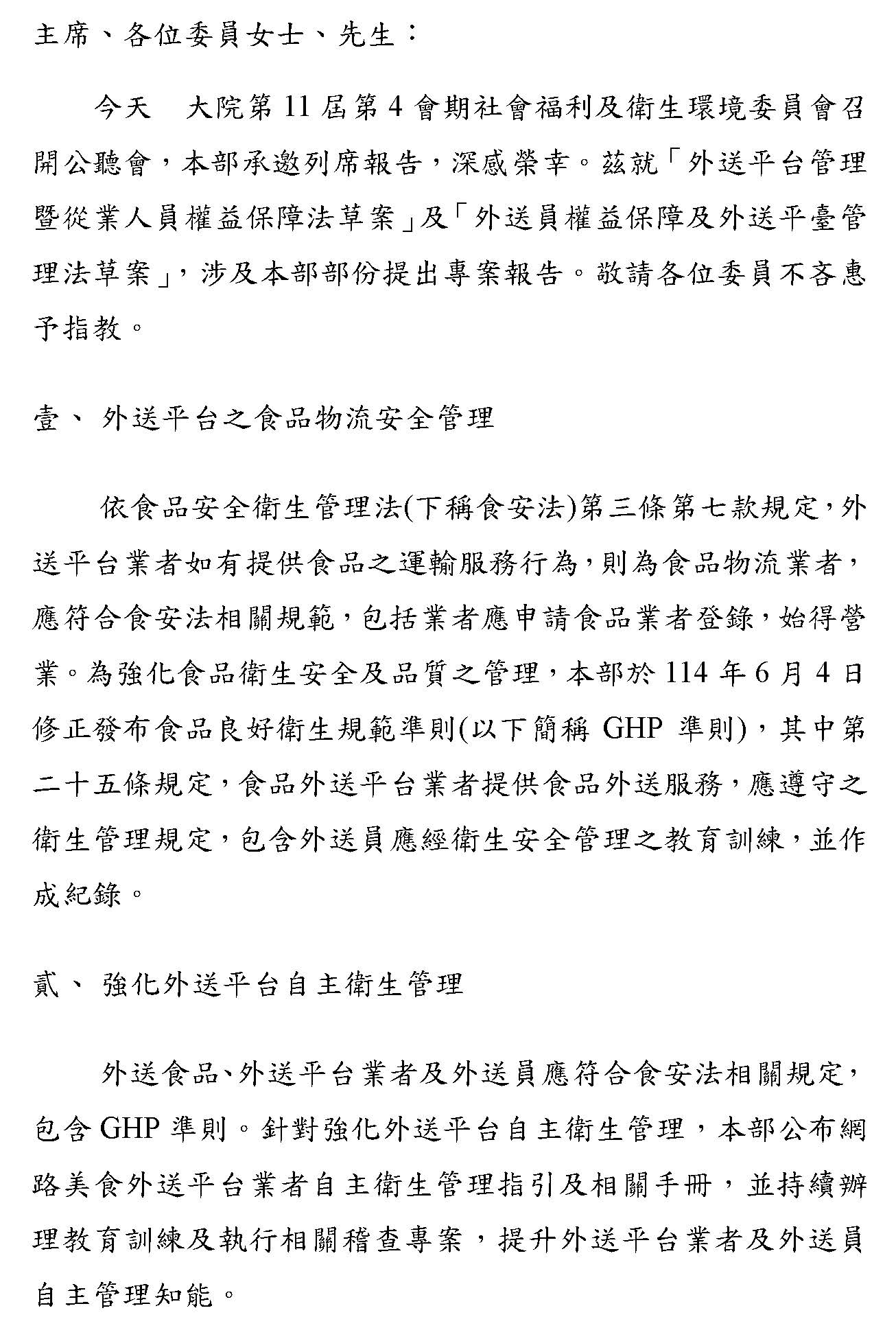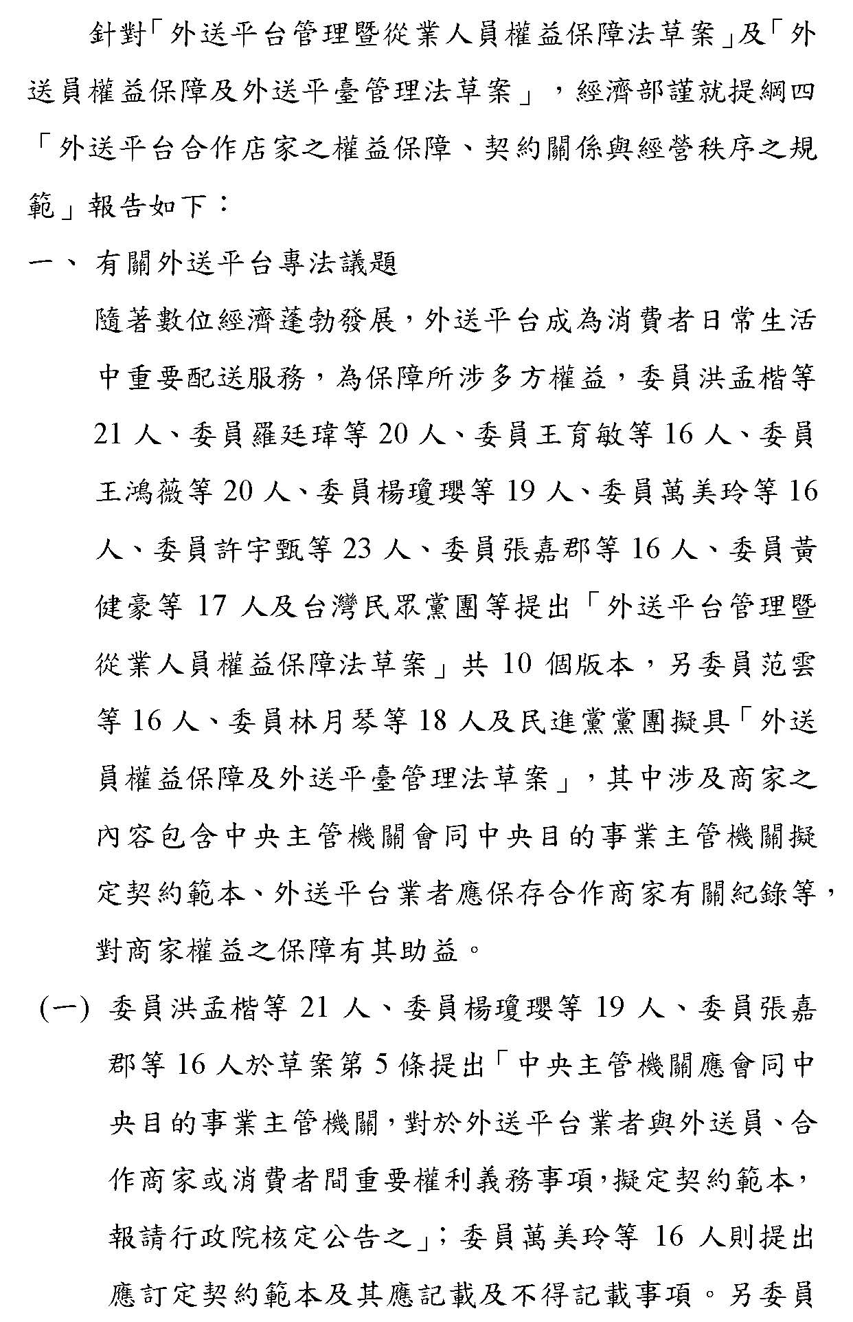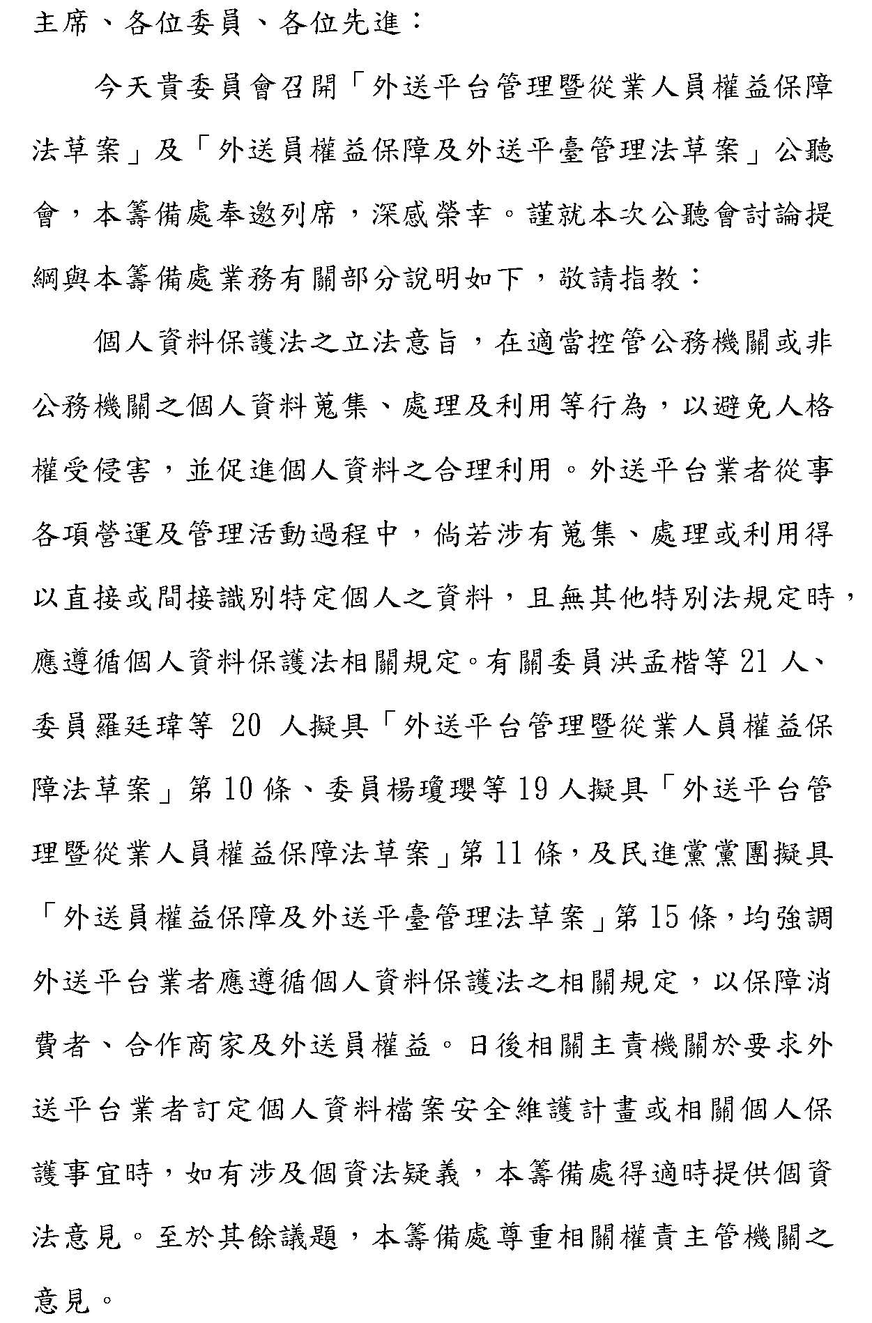「外送平台管理暨從業人員權益保障法草案」及「外送員權益保障及外送平臺管理法草案」公聽會(書面報告)
