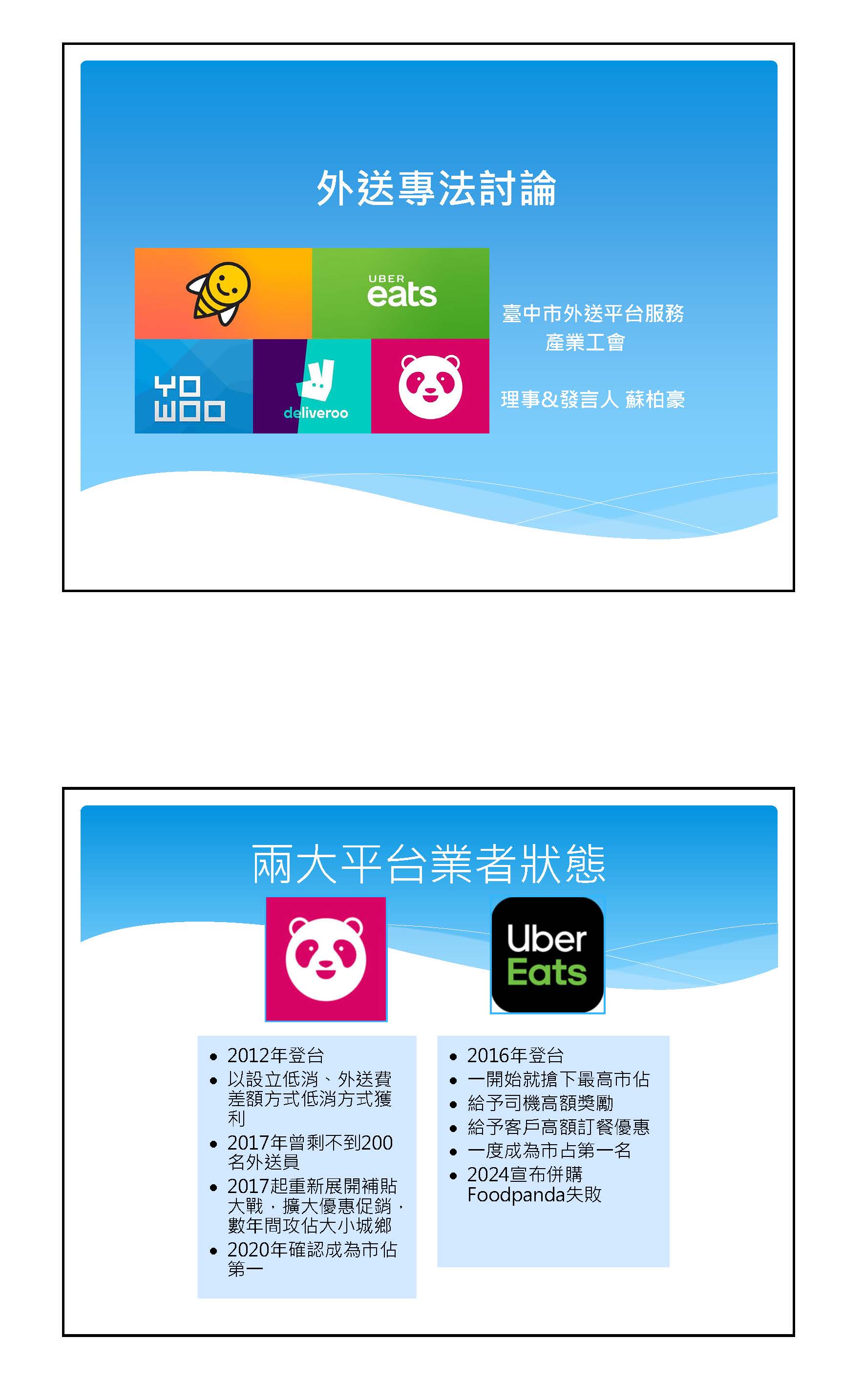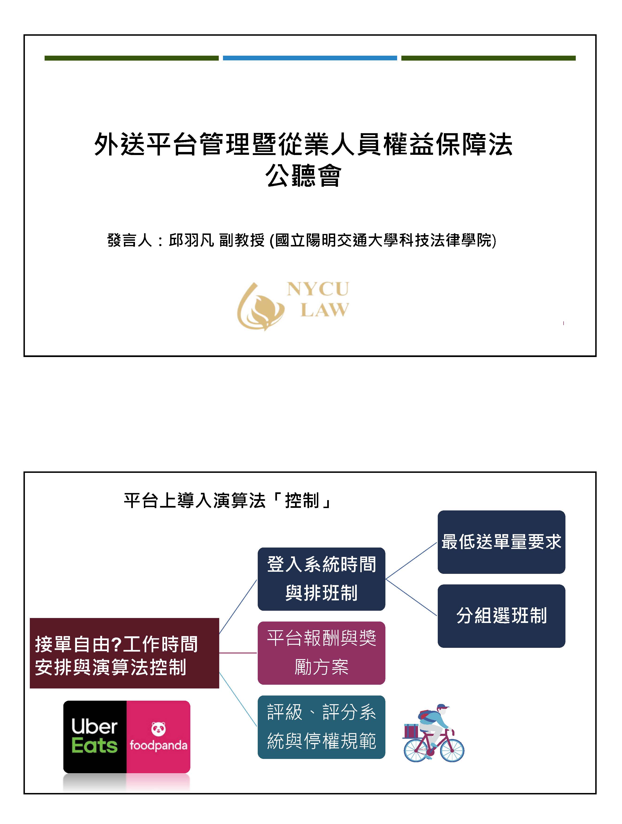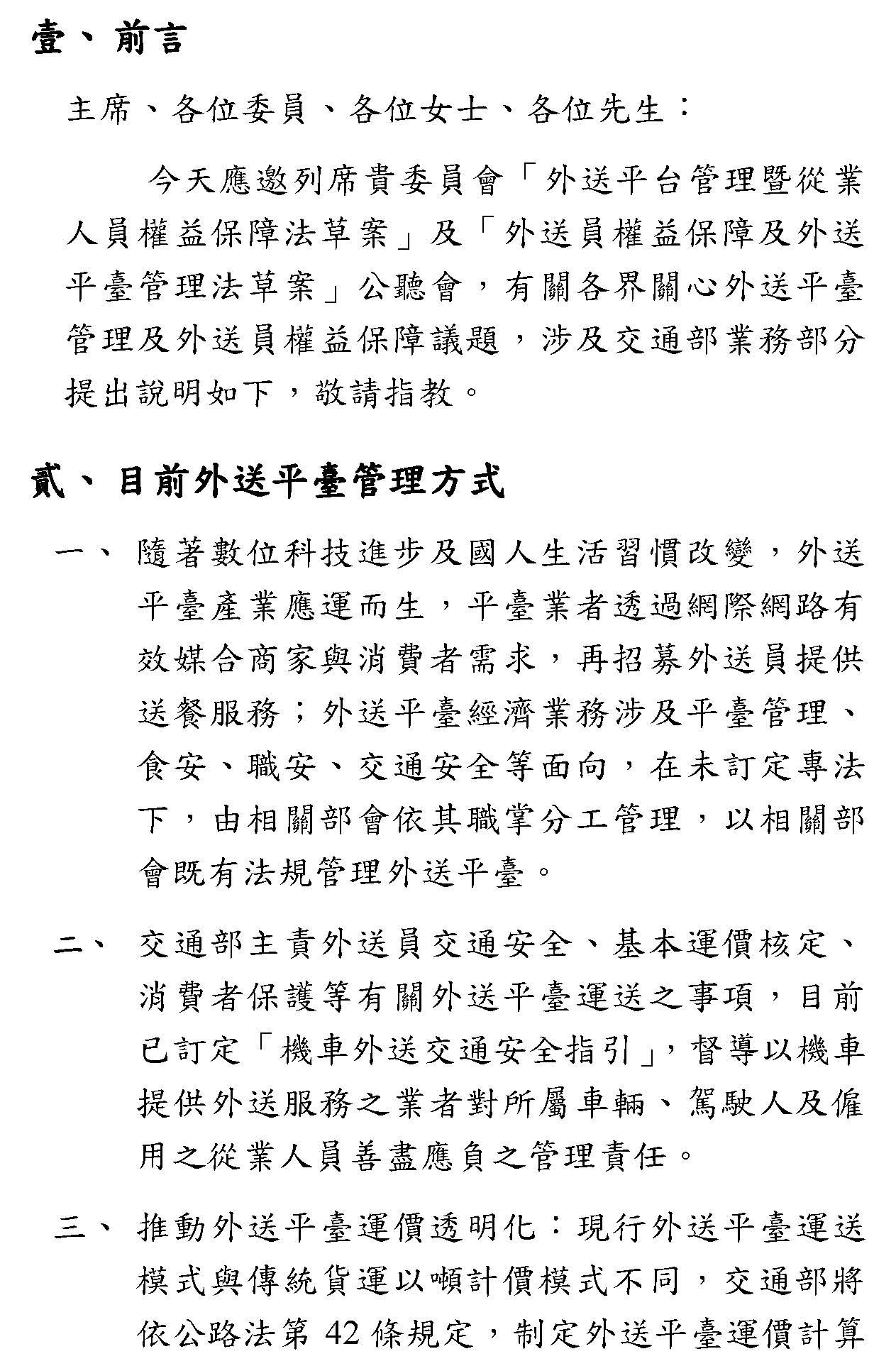 「外送平台管理暨從業人員權益保障法草案」及「外送員權益保障及外送平臺管理法草案」公聽會書面資料