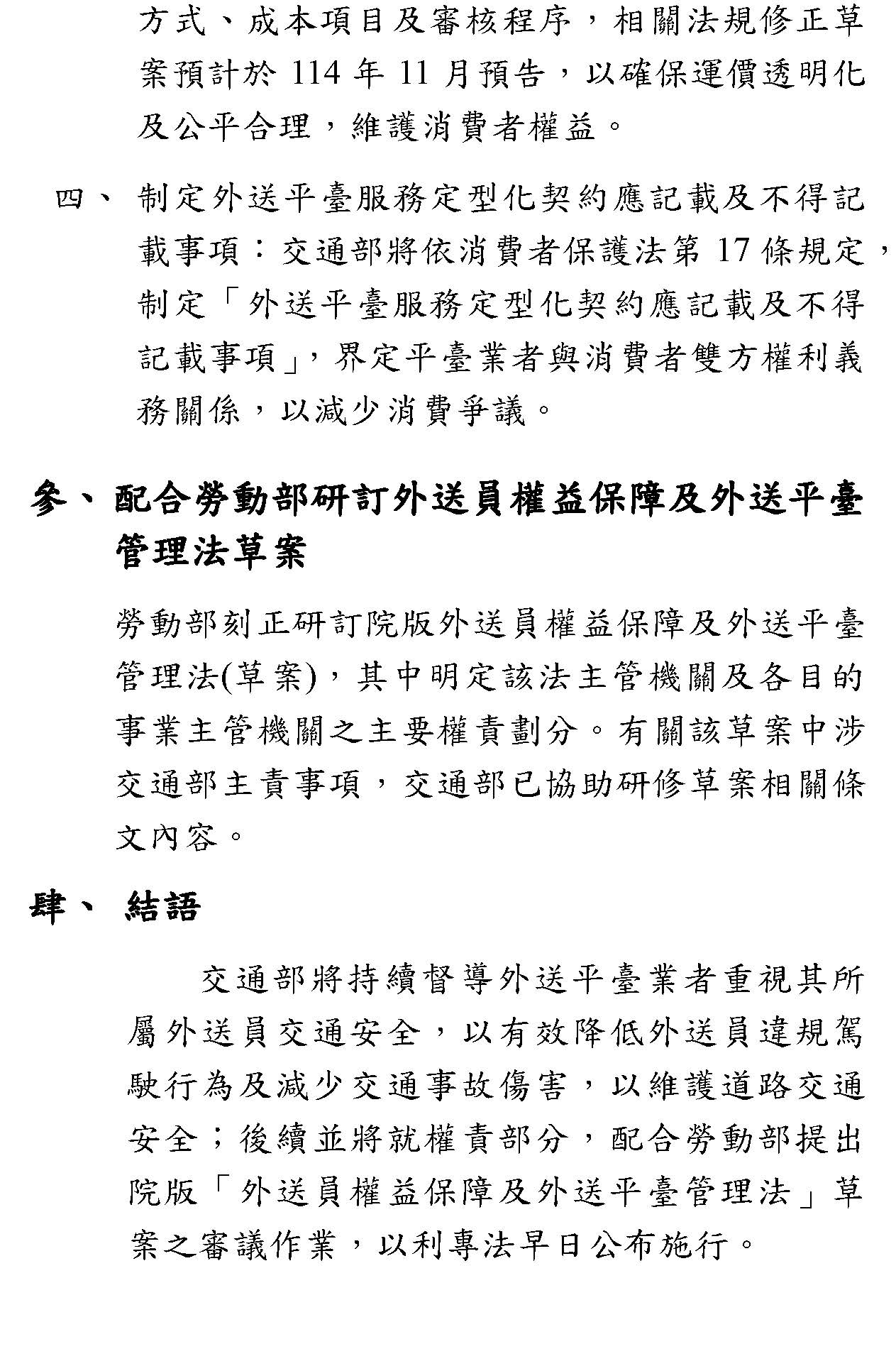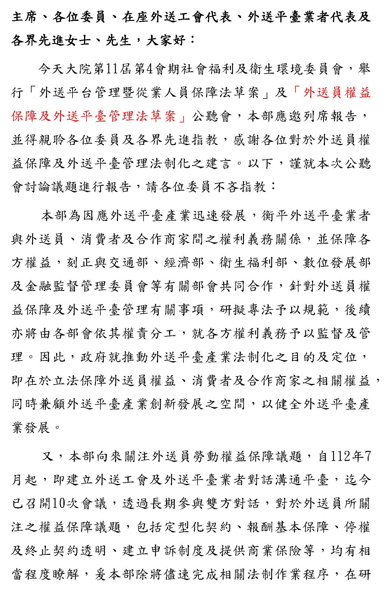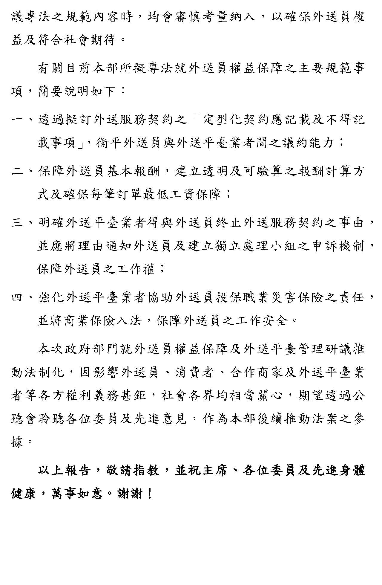 本部相當重視外送員權益保障的議題,從112年7月開始,勞動部就已經成立外送工會與平臺業者之間的對話平臺,目前已經召開10次會議,透過長期參與雙方對話,我們也非常了解外送員所關心的各項議題跟權益事項,包括定型化契約、報酬基本保障、停權及終止契約透明度、建立申訴機制及提供商業保險等等。因此,政府除了儘速完成相關法制作業程序外,在研議專法之規範內容時,針對這些意見,都將審慎考量納入,以確保外送員的基本權益及符合社會期待。