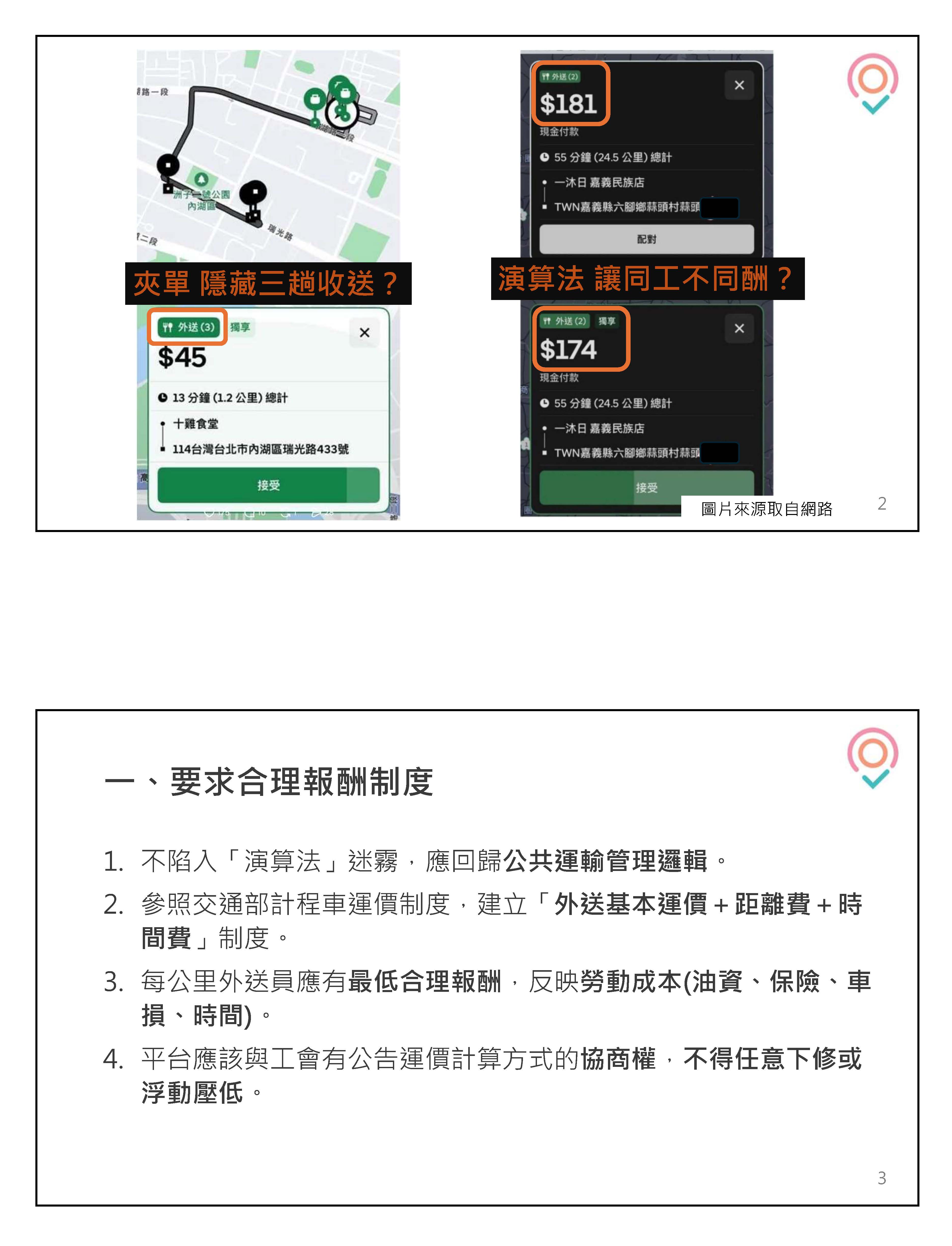 二、保障外送員基本報酬,建立透明及可驗算之報酬計算方式及確保每筆訂單最低工資保障。
