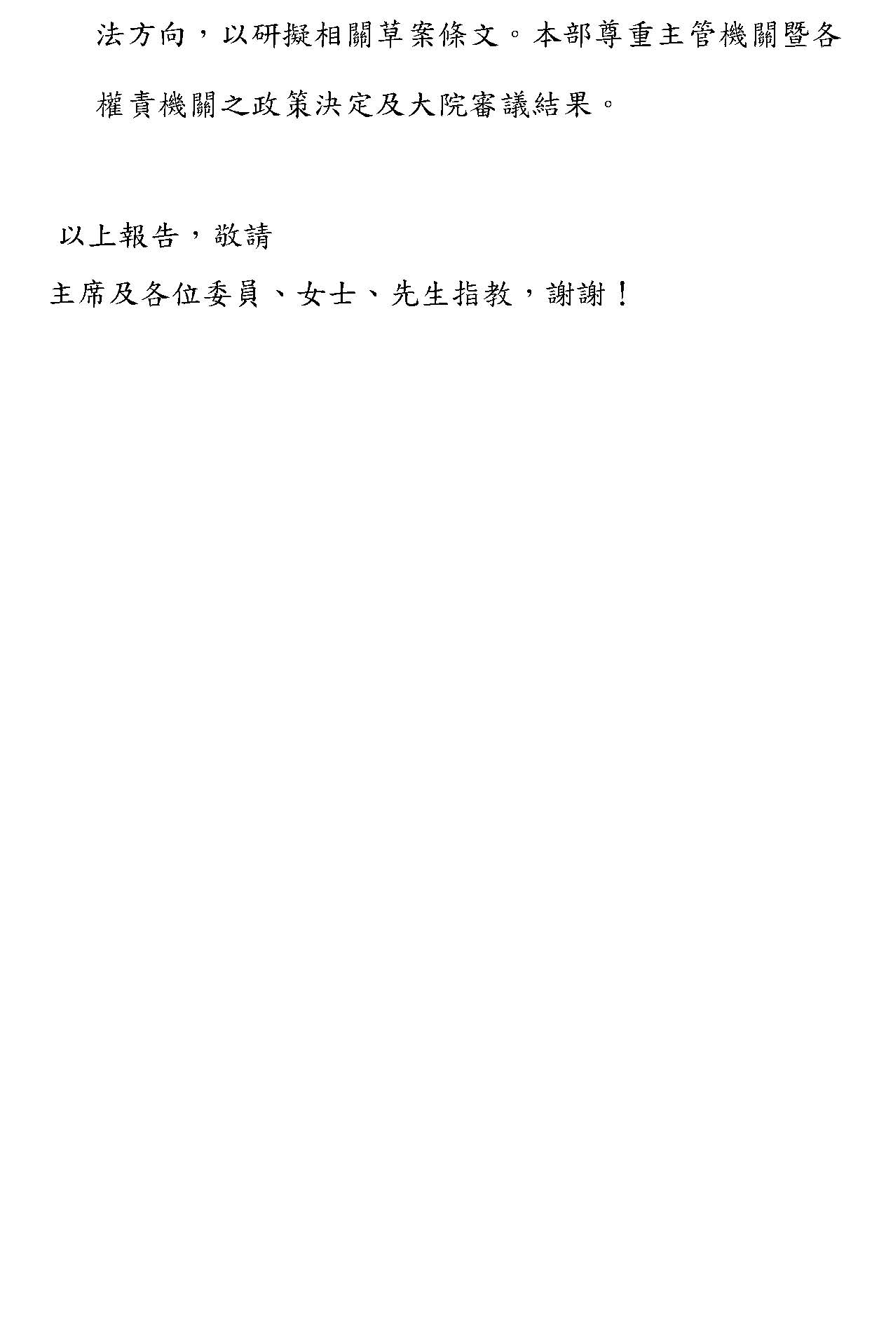 至於今天討論很多的停權、保險、報酬、運費這些相關規範的規定,就必須要仰賴主管權責機關多面向、多層次的思維及整體的配套考量,藉由專業的審慎評估作成政策決定,確立具有社會共識的政策及修法方向,來研議相關草案條文。本部尊重主管機關及各個權責機關的政策決定,以及大院的審議結果。以上。