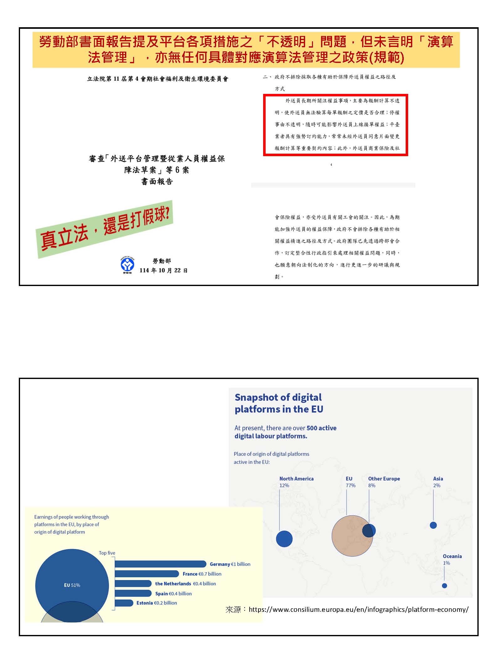當然剛剛不管是昭儒或是很多伙伴已經提到相關的問題,其實有幾個重點,說實在,我就不占用大家的時間。我記得我們在三年前的世界尊嚴勞動日有一張文宣,有一張海報是針對外送員的,因為勞陣在2020年就已經進行過一波外送員的普查,有一個問卷調查。三年前的海報,其實我們挑戰的一直都是演算法,我們挑戰的就是剛剛有許多先進提到的不透明這個事情,它在這個勞動過程裡面,它在這個商業的運作過程裡面,對於不同的利害關係人所造成的危害或者造成的傷害,我覺得這部分其實是一個很重要的立法內容,是要根本解決跟處理的事情。尤其是演算法的不透明,以及法律關係定性的問題,會讓勞工或讓勞動者處在更弱勢的狀態。這部分希望在立法的過程裡面,能夠有更明確的一些原則性規範。我說這個原則性的規範就是說,已經六年了,該有的爭議大家其實也摸得差不多了,業者的聲音、工會的聲音、學者專家的聲音,其實我們大概已經很明確地知道。在這樣的一個邏輯之下可能會產生的問題,事實上已經可以用法律很明確地規範去避免爭議,所以我覺得這部分是在未來立法裡面,我們期待看到的。