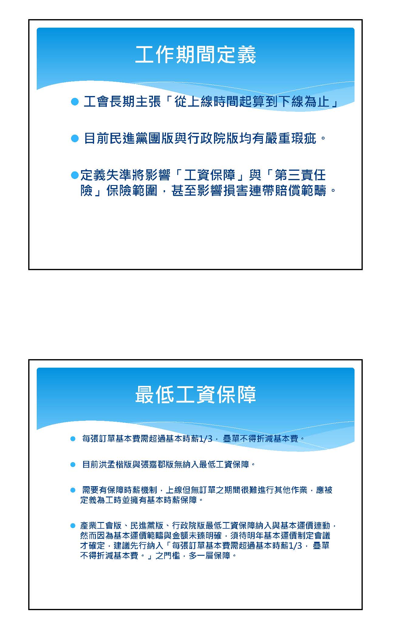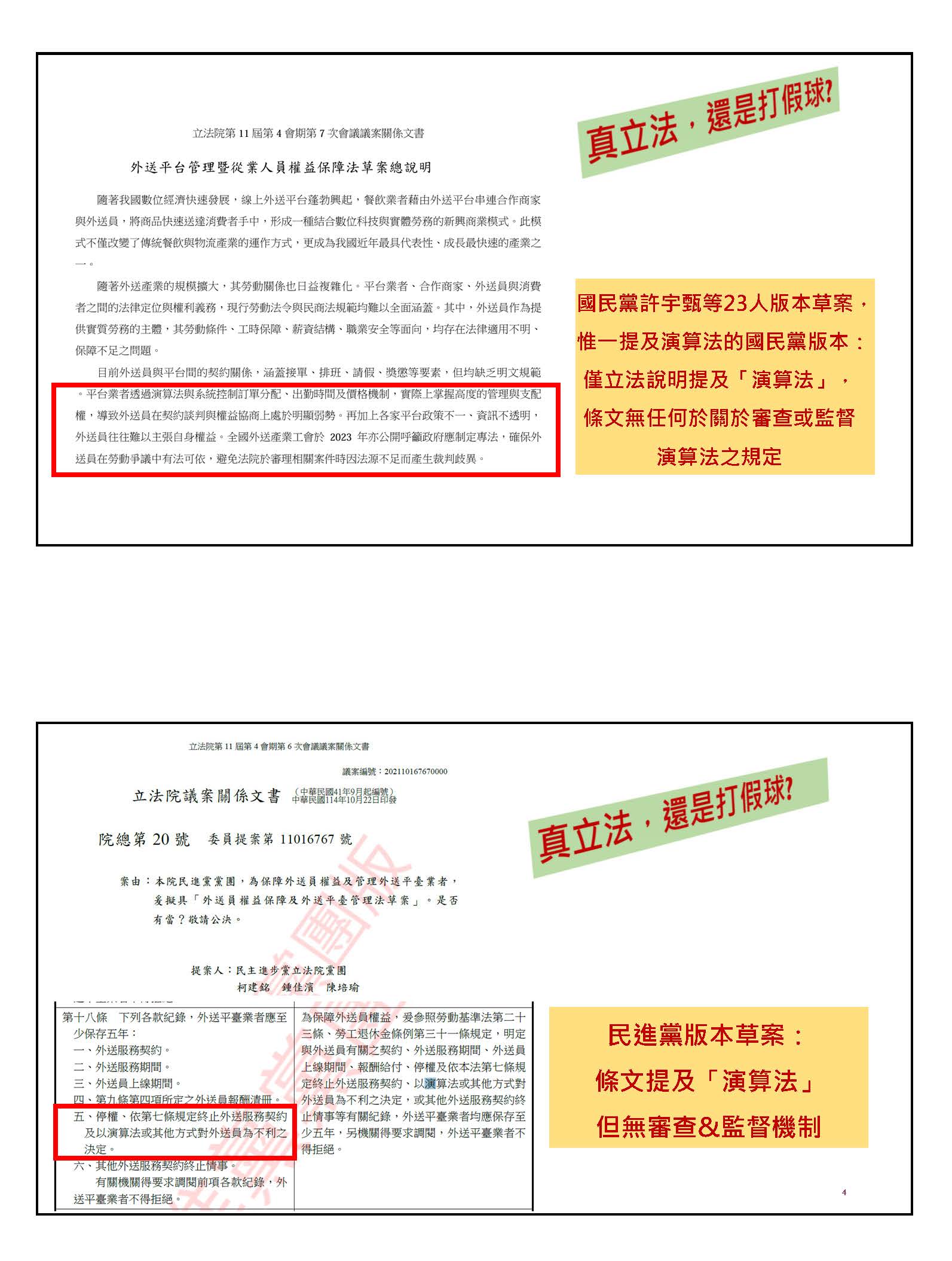 第二個主張,我常收到外送員的陳情跟抱怨,除了薪酬結構以外,最常接到的問題就是對於爭議事件處理的不透明。這些爭議可能是來自沒有太多客觀證據的顧客投訴,缺乏具體事證的檢舉內容,又或者是沒有申訴機制的停權處分。對於以此為生的外送員來講,我覺得影響非常地嚴重,可能長時間會減少他的收入,我認為這也是專法必須要處理的。因此,我的草案版本裡,針對報酬金額、計算方式、給付、停權、違規、終止契約跟其他對外送員不利決定,還有外送員跟合作商家或消費者就外送時所發生的爭議要有申訴機制以外,還有這些過程、內容都應該公開揭示、留存紀錄資料,甚至外送平臺業者不得因為外送員提出申訴或協助他人申訴,而事實上予以不利對待,這也是我的版本裡面有的。