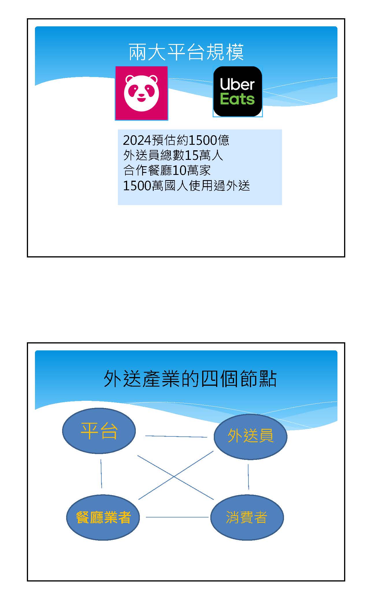 陳副處長俊廷:回主席,當時我們做的是從競爭法的觀點問了一個什麼樣的問題呢?就是如果價格提高的時候,消費者會怎麼選擇,是離開平臺不使用、轉往其他的餐廳,還是跳到別的平臺?我們是從競爭的觀點來做分析的,就是當平臺譬如foodpanda跟Uber Eats一結合之後,市場競爭就減少;競爭減少,他們很有可能就會提高價格;一提高價格的時候,我們看的是消費者及店家他們如何去選擇的問題,是繼續使用外送平台還是就直接跳離了,這個就會影響到消費者對他們的抗衡力量,我們是從這個觀點來看待,這個報告是這樣子。