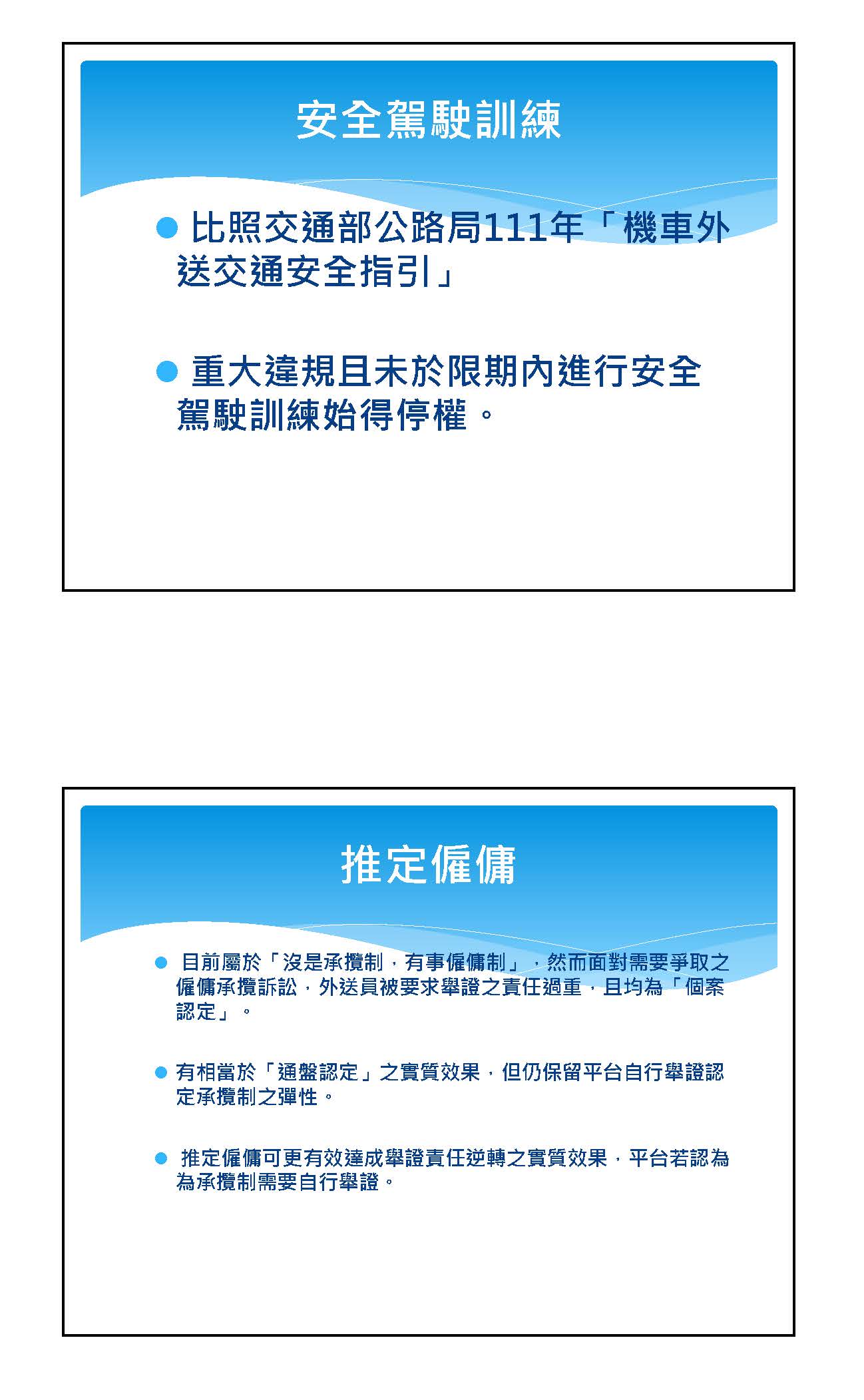 主張三,職業安全也是我相當關切的課題,尤其在臺灣有巨大風險的交通環境裡,對於長時間暴露在其中的外送員來講的話,相當不利,過去的數據也顯示交通事故頻繁,可是根本就不能夠完全歸罪於外送員本身。所以,我的版本裡也參考臺中跟高雄現行的自治條例作法,將交通安全教育訓練時數明定出來,讓外送員可以接受相關的訓練。