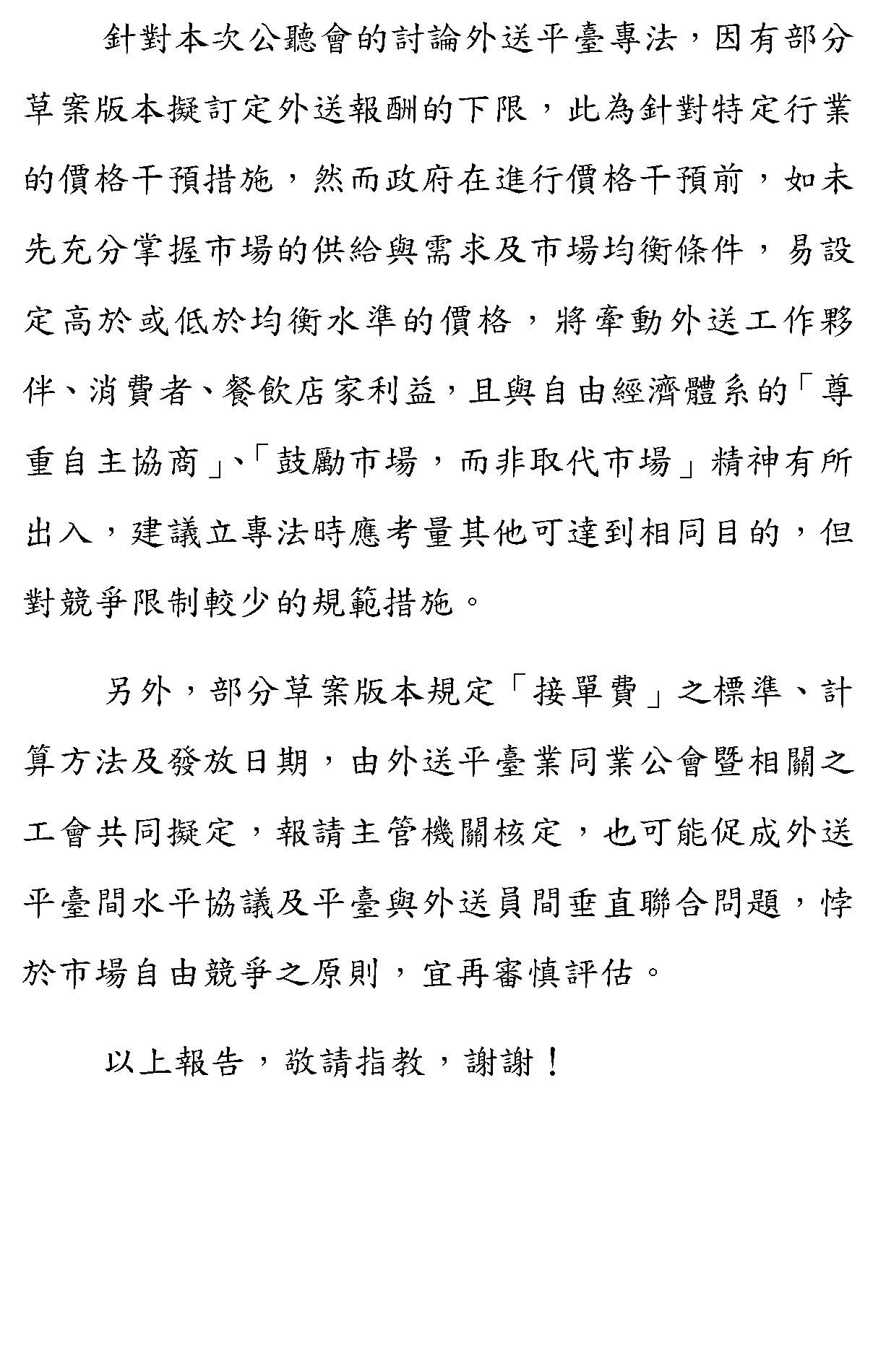 至於什麼樣的價格是最好的?其實就是不要人為去干涉的。我們當然理解這次公聽會與會的社會賢達及相關委員都期待針對外送的報酬訂定下限,作為對外送員的保障,我們理解,但是我們認為在這種時候其實就是一種人為的干預。人為干預一定會比較好嗎?我們不知道,應該說對於價格的高或低,我們認為如果是市場決定出來的價格,公平會是沒有意見的,但如果經過立法的過程決定要進行干預的話,我們只能在此提醒它反射出來的影響,必然在平臺、消費者及店家等等交易關係的價格上也會造成連動的影響,但我們沒辦法預測,我們只知道,如果一方面的價格干涉不可能不牽動到另外一方面其他平臺各相關方的利益,那該怎麼去調整?當然就需要我們整個社會的共識。