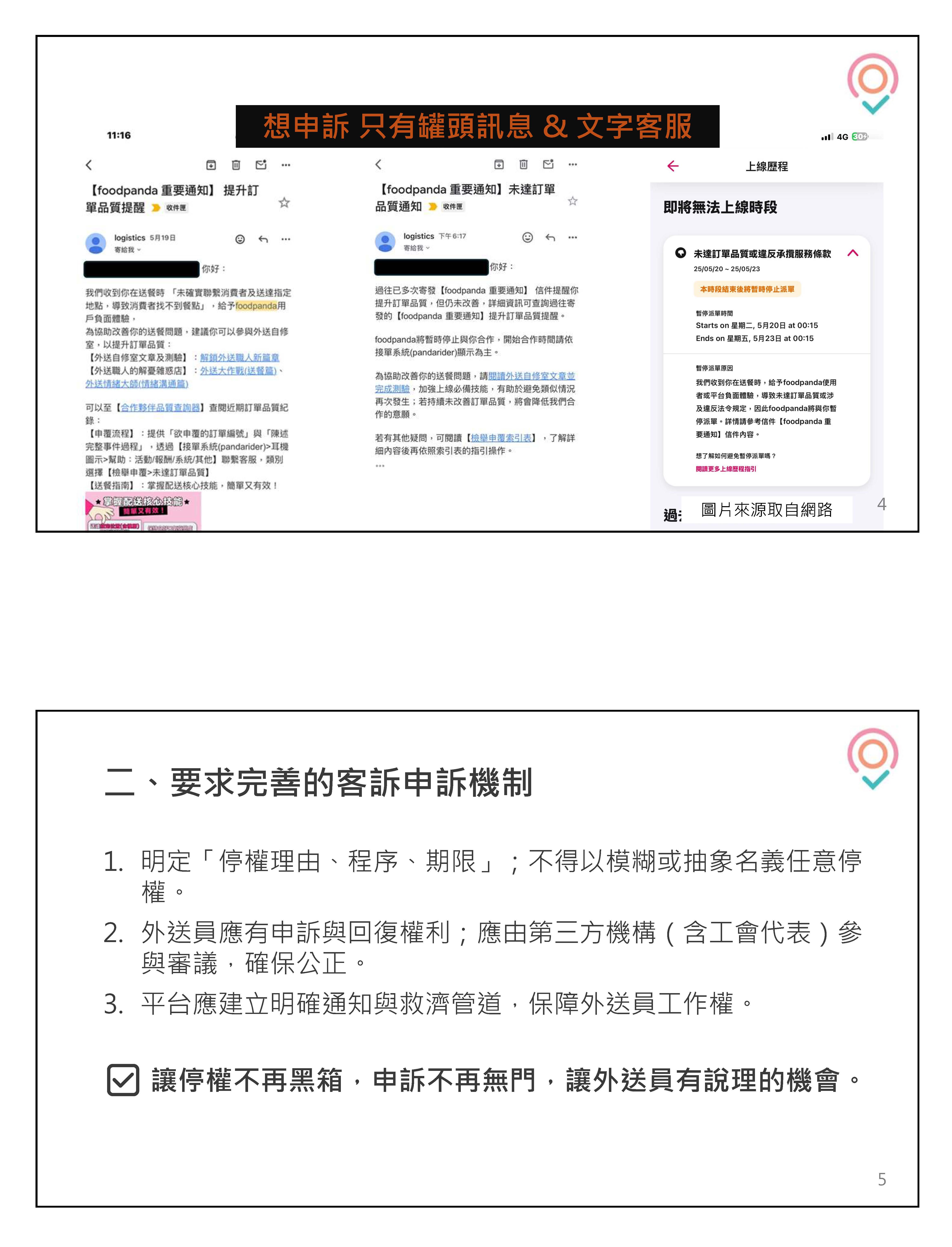 第一個,停權的問題。其實外送員被停權就相當於他被剝奪了工作機會、工作權,現在平台時常會用系統判定,譬如說異常接單就封帳,然後沒有通知外送員,也沒有說明,有人外送了一年多、兩年多,一天突然不能上線,收入馬上就歸零,沒有辦法繼續工作。我們要求的是,平台停權要有程序、要說明理由、要能夠申訴,平台不能夠一鍵把外送員的工作全部封殺,也不能透過演算法的方式,取代人去判定這個人是不是上線。因為現在很多平台不是因為外送員違法或被投訴,而是單純這個外送員接單率太低,或是拒單次數太多就被封帳,這其實不是平台與外送員間一個平等、合理的合作關係,就是單方面制定這些規定,這些指標像外送員可能今天只是臨時想要休息,或是遇到天氣比較差,或是要避開一些危險地點,他就要被系統判定效率不足,所以要被停權,這樣停權是沒有合理的,也不是明確的標準,而且也沒有提供申訴機制。所以我們主張停權必須要有合理的依據,除非違法或違約,或是造成安全事故的重大情節,而且要有通知、說明、申訴及復權的程序,接單率太低並不是應該要被封帳的理由。