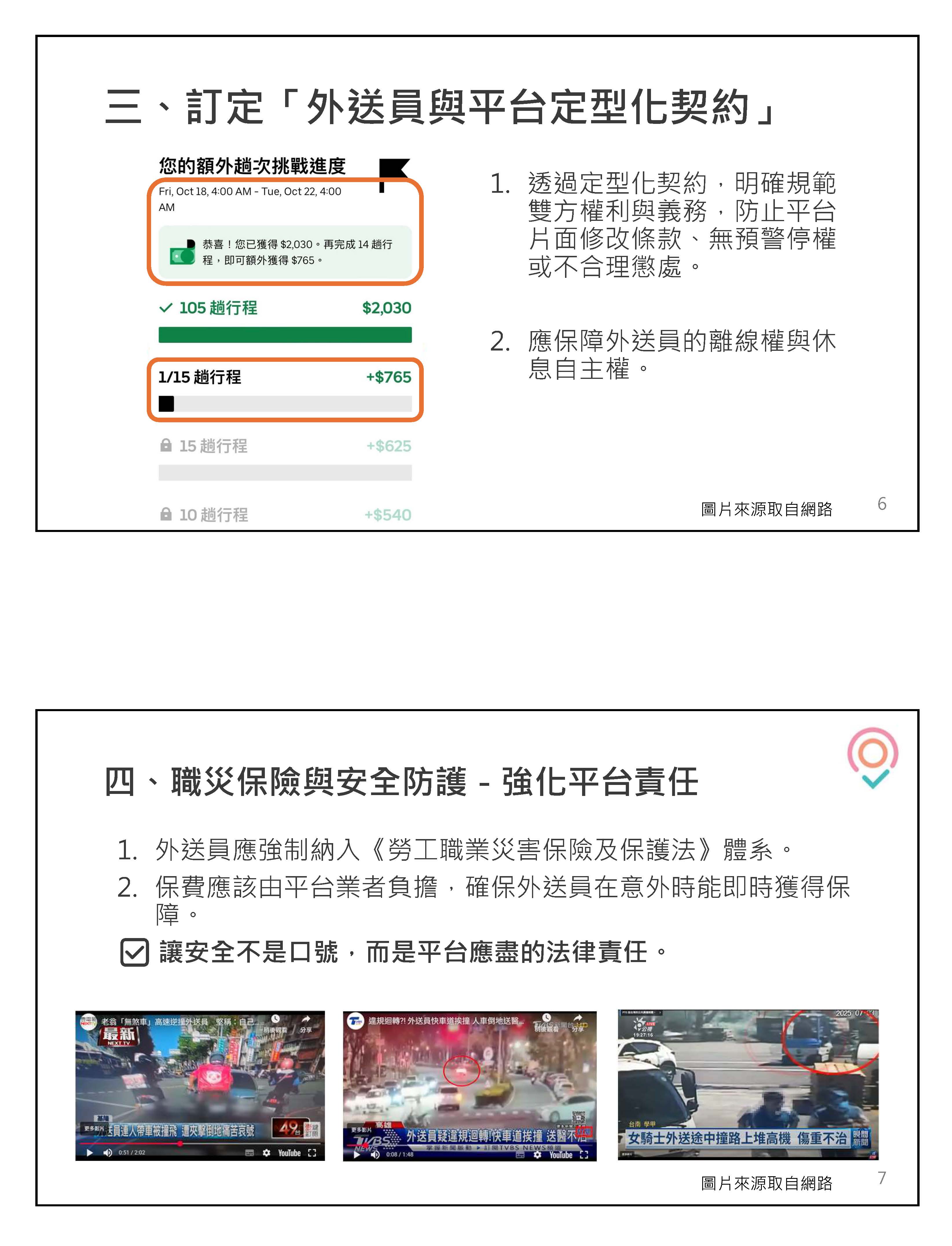 第二個,契約問題。現在外送員跟平台簽的都是電子契約,實際上就是平台想要變動就變動,app只要更新,條款就會變動,報酬公式可能也跟著變動,不同意你就不能上線,也沒有任何選擇。我們認為契約應該要寫清楚計費方式、派單原則、停權條件,平台如果要更改必須要公告內容、說明理由,讓外送員有知情及表達的機會。