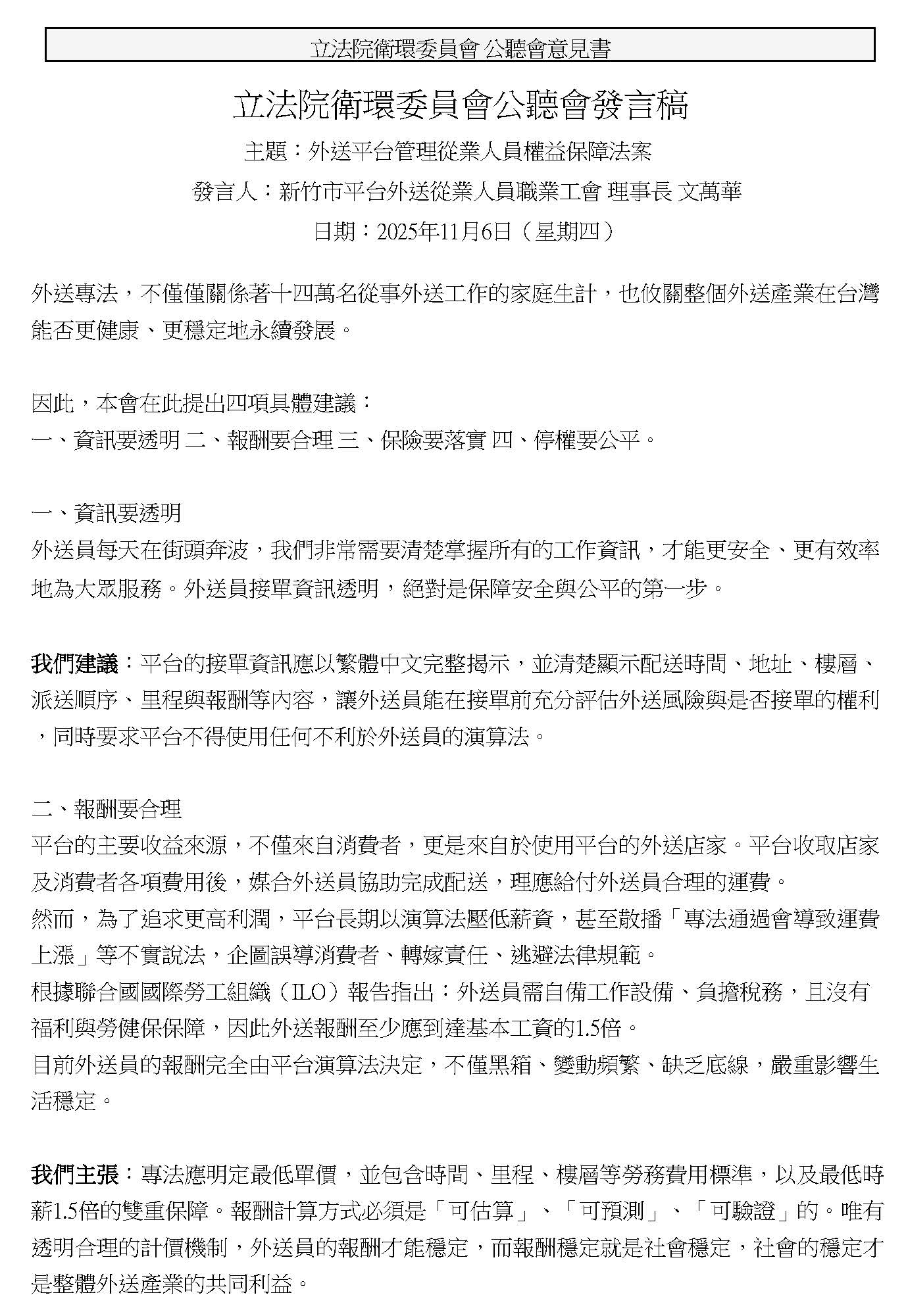 「外送平台管理暨從業人員權益保障法草案」及「外送員權益保障及外送平臺管理法草案」公聽會書面報告