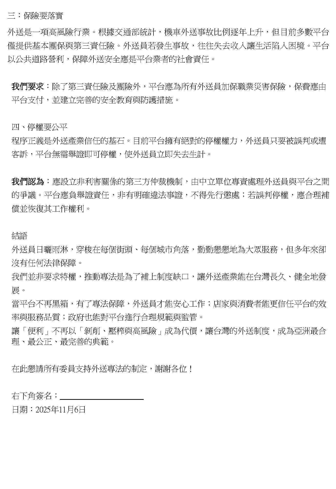 第四,目前草案裡面主要處理到的是食物外送員跟平台之間的義務,但是除了食物外送,目前其實像是多元計程車,或是有一些透過第三方app去接單的司機,他同樣也是透過平台接單,他也是適用同樣一個類似的制度,差別只是在於他是運送人或是運送食物,他們其實基本上狀況是一樣的,所以我們會希望專法也可以把這塊制定進去,我的發言大概就這樣。