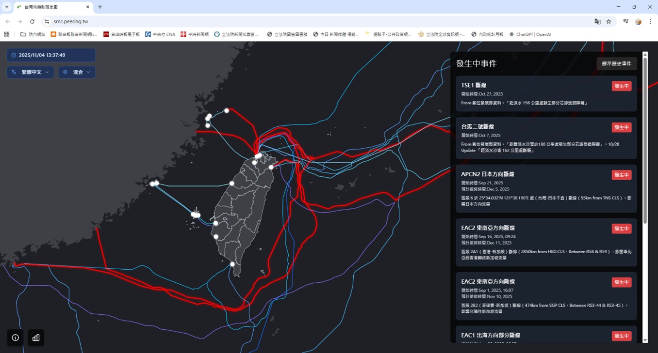 據台灣網路資訊中心(TWNIC)統計,台灣擁有10條國內海纜與14條國際海纜,承擔99%以上的對外網路流量。114年10月18日國際海纜亞太直達海纜(APG)S3區段於距離崇明約66公里處發生海纜障礙,初步評估原因海纜供電異常,國安局資料顯示,全球海纜每年平均發生超過150次斷纜事件,台灣周邊每年平均發生7至8起海纜事故,其中包括中國抽砂致纜裸露、漁船拖網與貨輪錨泊破壞等情形。因此,這些事件反映出海纜風險並非單一來源,而是漁業、商業與地緣政治多重因素交織的結果,2025年初更曾在2個月內發生4起。