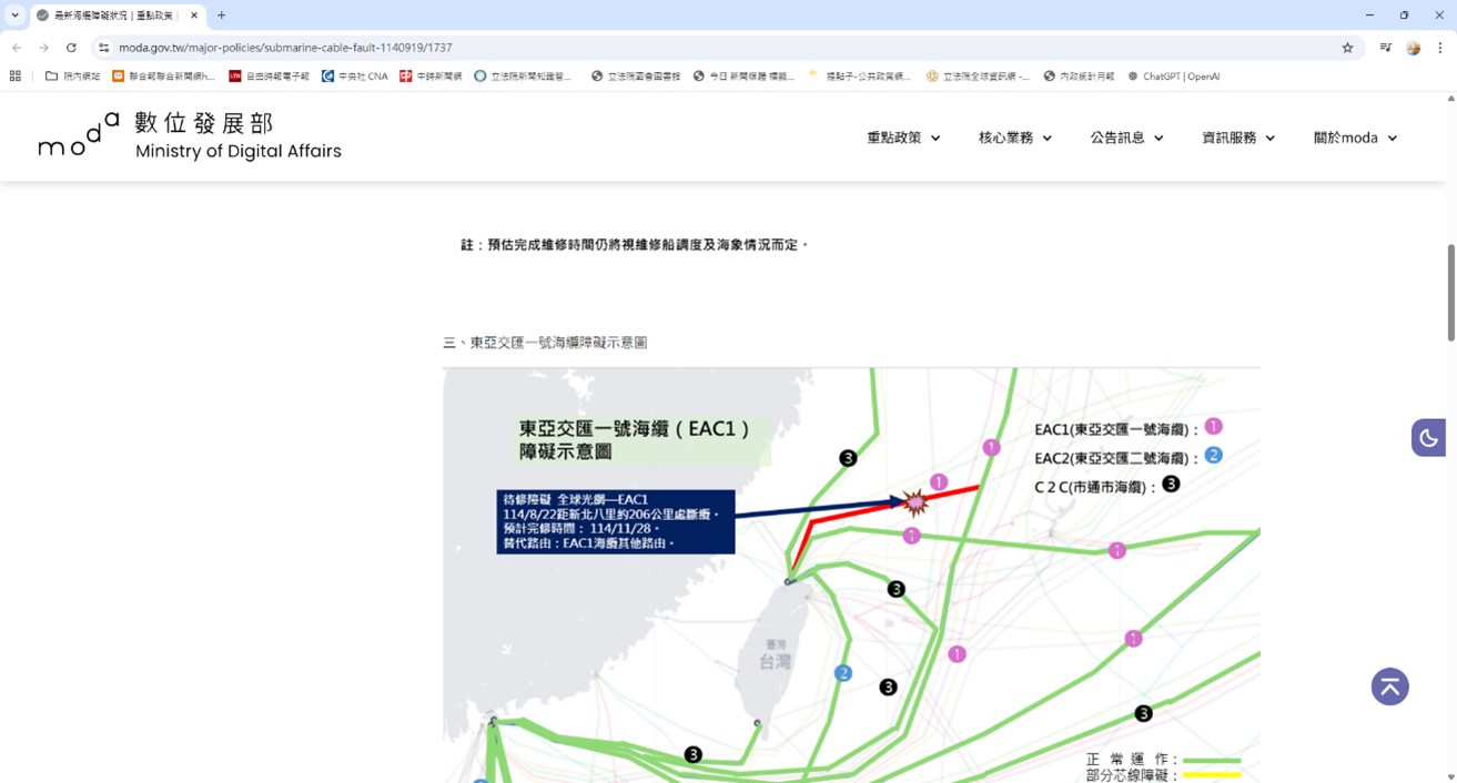 3.對外揭露「最新海纜障礙狀況」:本部於官網設立「最新海纜障礙狀況」專區,以圖表方式及時對外公開相關資訊,並於海纜障礙期間持續更新,以利各界掌握正確海纜障礙資訊。