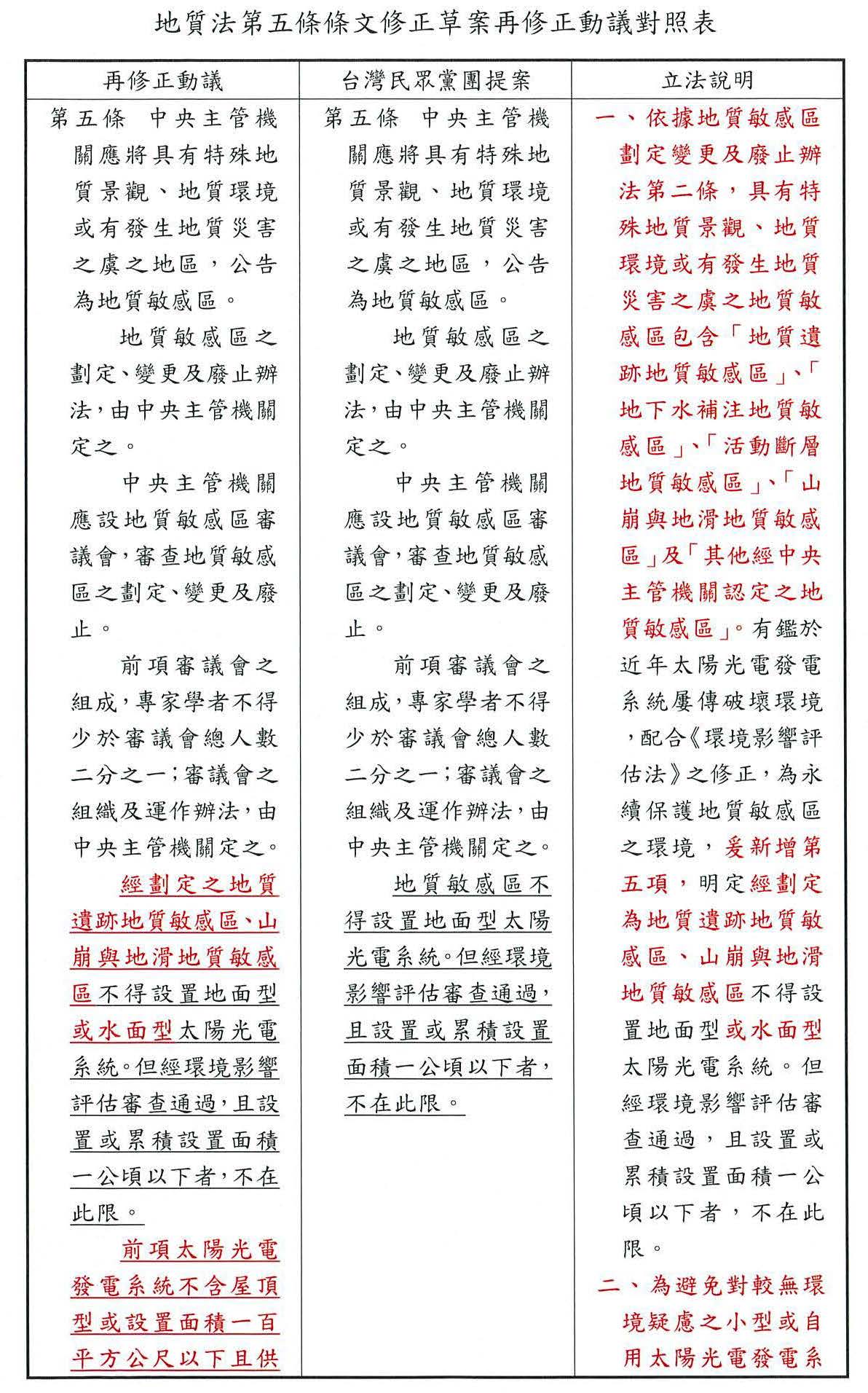 在這一次地質法的修正當中,非常多環保團體要求台灣民眾黨把地質敏感區域納入保護的範圍,不要再讓地質敏感區有光電板入侵,這個聲音我們聽到了;也有環保團體說希望能夠進一步地限縮在地質遺跡、山崩與地滑的地質敏感區,這些聲音我們也聽到了。