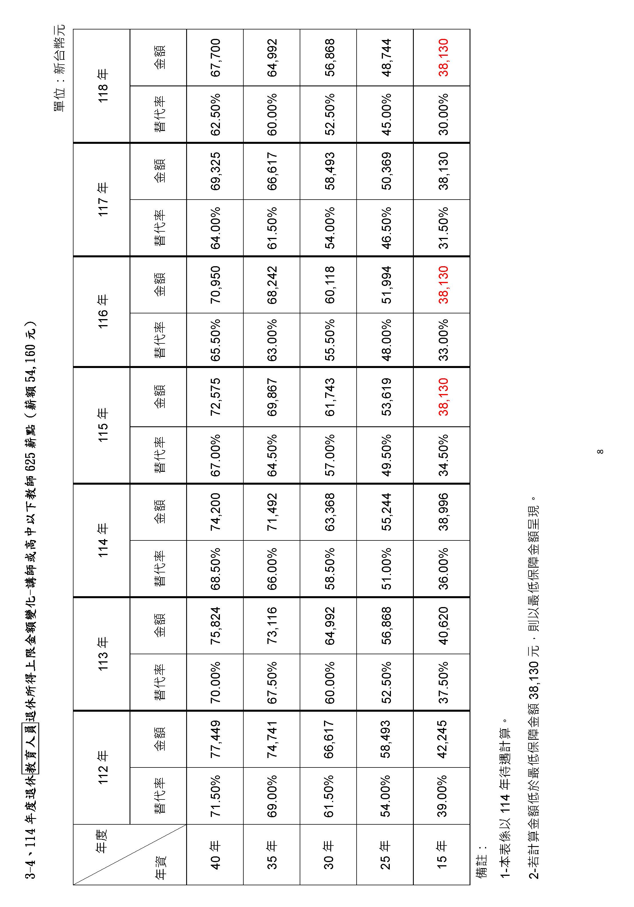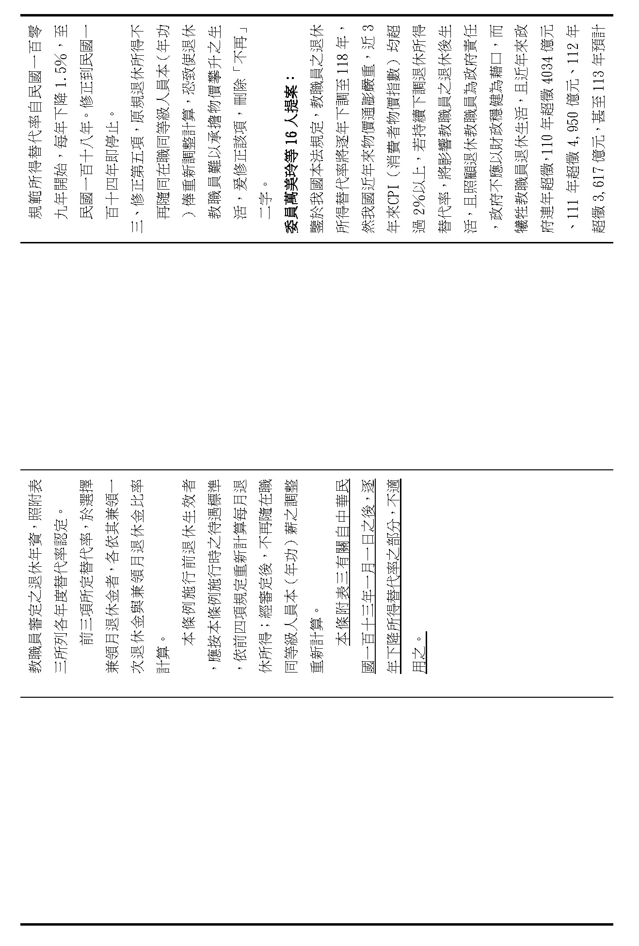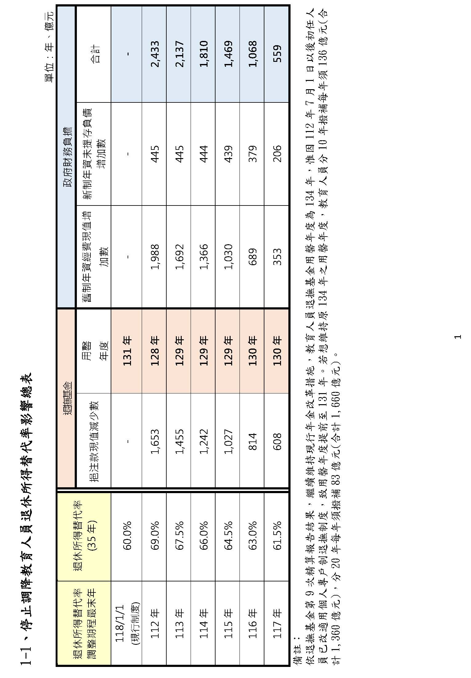 幾位委員在說的砍到見骨、砍到見血,我們都沒有人想要虧待任何在臺灣生活、努力打拚的國人,但是我們要看看,以今天的……來,請注意聽!今天的教育人員,我手上拿的是教育人員的這一本,昨天是公務人員的這一本,兩相比較,我們可以更清楚地看到,就以最後一欄,也就是以年改如果完成的118年來比較,教育人員領的中位數退休俸是65,100、六萬五,最高金額(在118年)可以領到98,058、九萬八千元,這都遠高於昨天的公務人員,而且高了八、九千元以上,這樣子的金額,一個月5萬、6萬、8萬、9萬,這是難以維持基本生活?這是砍到見骨嗎?大家好好去思考這個問題,真的好好去思考退休金的制度是維持基本生活所需,如果七萬、八萬以上……今天鄭部長已經清楚地說,現制85%的教育人員退休俸是5萬以上,年改維持下去,如果持續進行,有69%的老師們退休後可以領5萬以上,而月退的平均在老師是5.8萬元。我們就讓數字來說話!