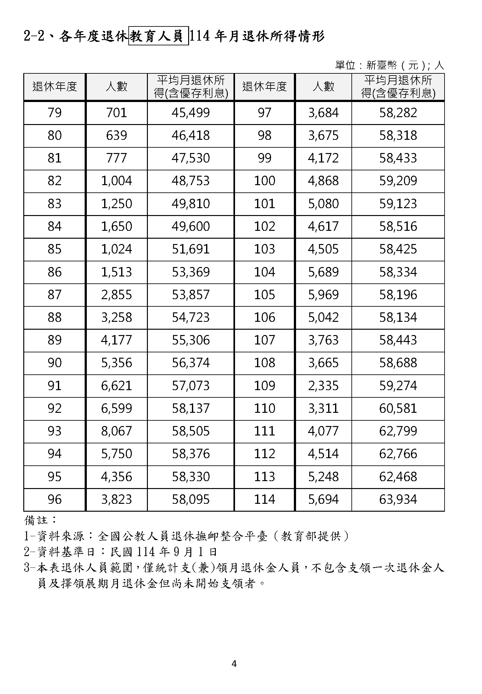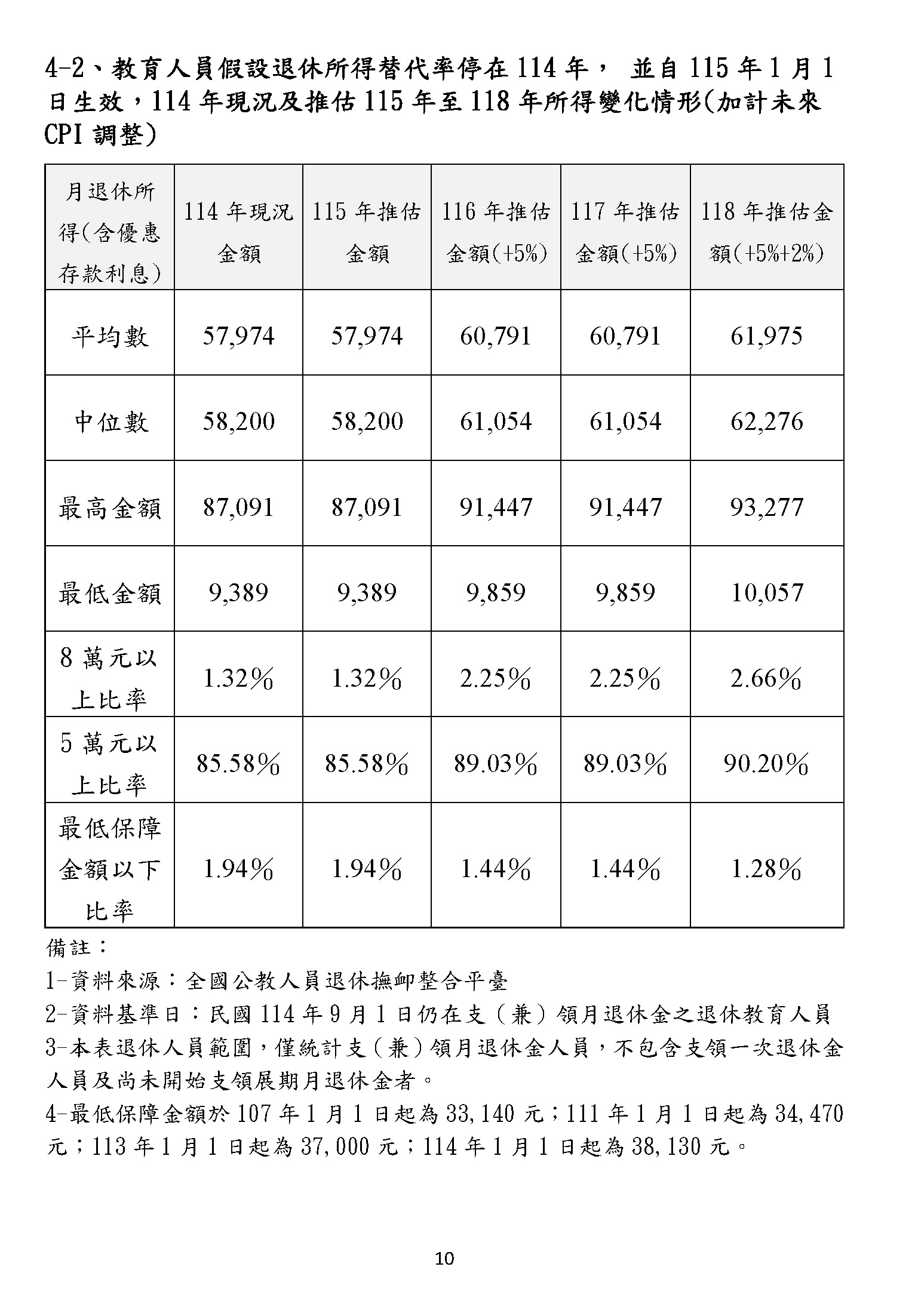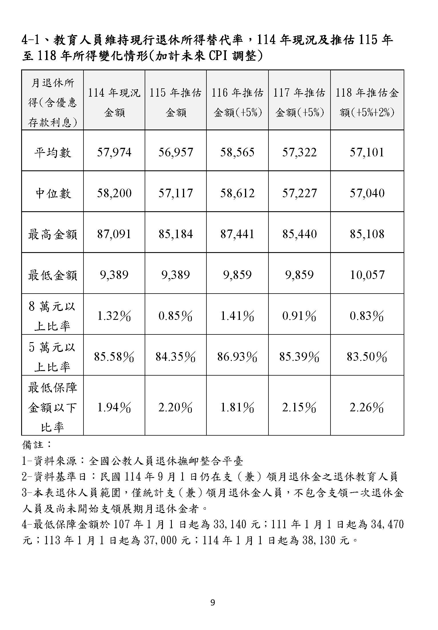 幾位委員在說的砍到見骨、砍到見血,我們都沒有人想要虧待任何在臺灣生活、努力打拚的國人,但是我們要看看,以今天的……來,請注意聽!今天的教育人員,我手上拿的是教育人員的這一本,昨天是公務人員的這一本,兩相比較,我們可以更清楚地看到,就以最後一欄,也就是以年改如果完成的118年來比較,教育人員領的中位數退休俸是65,100、六萬五,最高金額(在118年)可以領到98,058、九萬八千元,這都遠高於昨天的公務人員,而且高了八、九千元以上,這樣子的金額,一個月5萬、6萬、8萬、9萬,這是難以維持基本生活?這是砍到見骨嗎?大家好好去思考這個問題,真的好好去思考退休金的制度是維持基本生活所需,如果七萬、八萬以上……今天鄭部長已經清楚地說,現制85%的教育人員退休俸是5萬以上,年改維持下去,如果持續進行,有69%的老師們退休後可以領5萬以上,而月退的平均在老師是5.8萬元。我們就讓數字來說話!