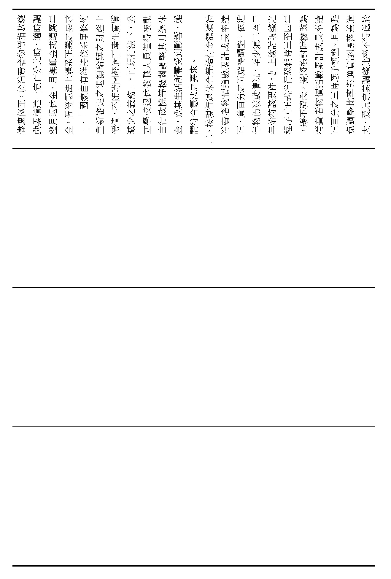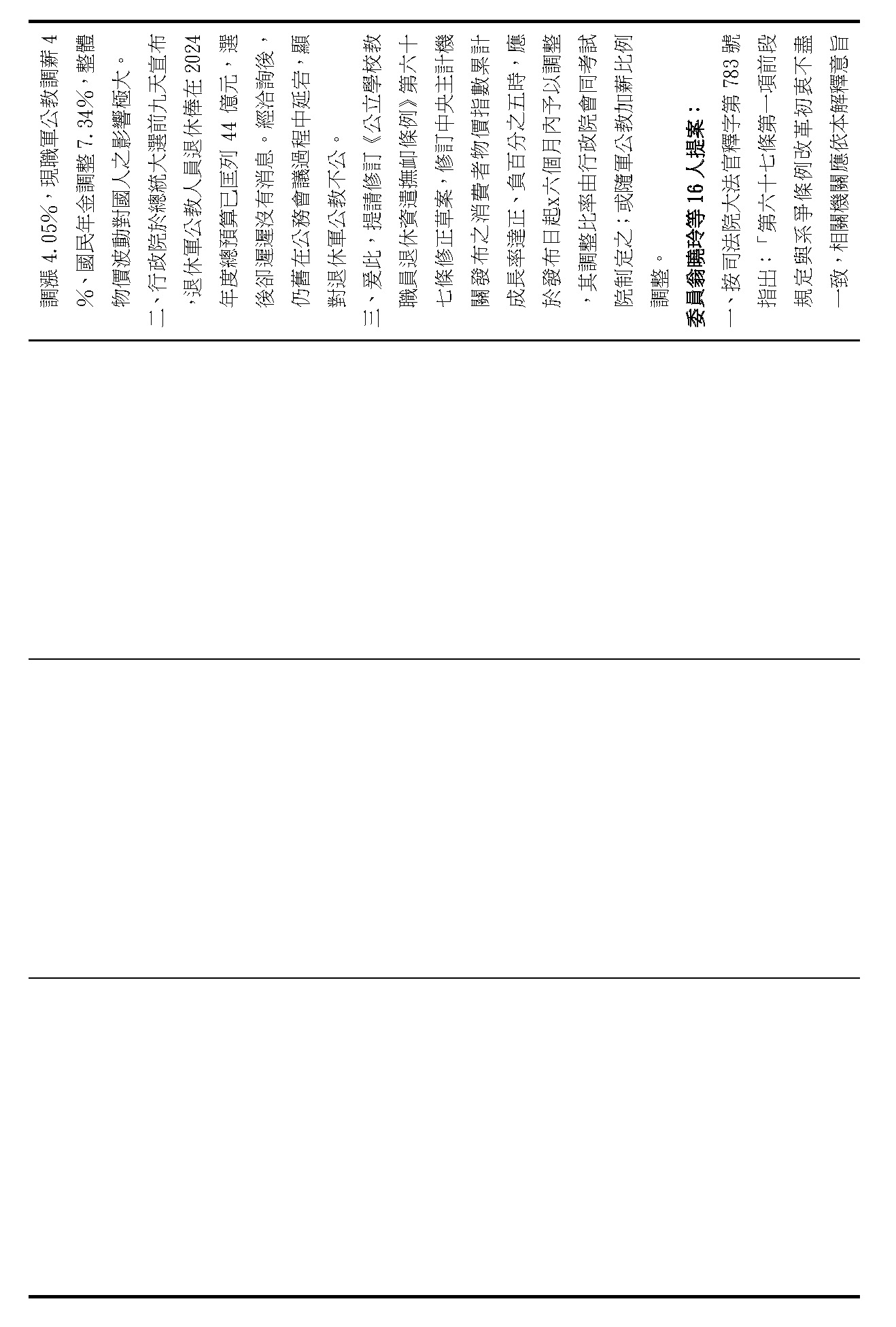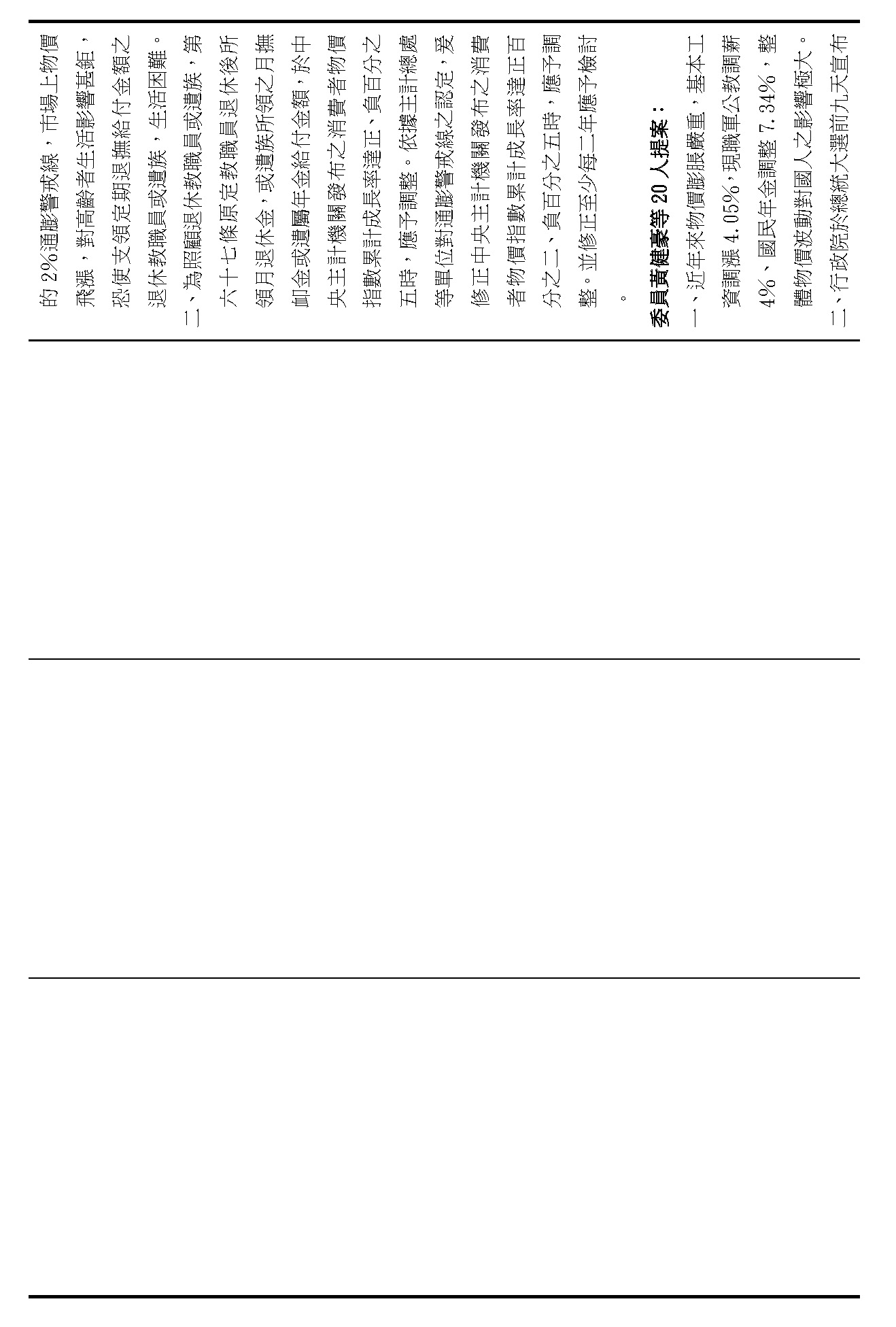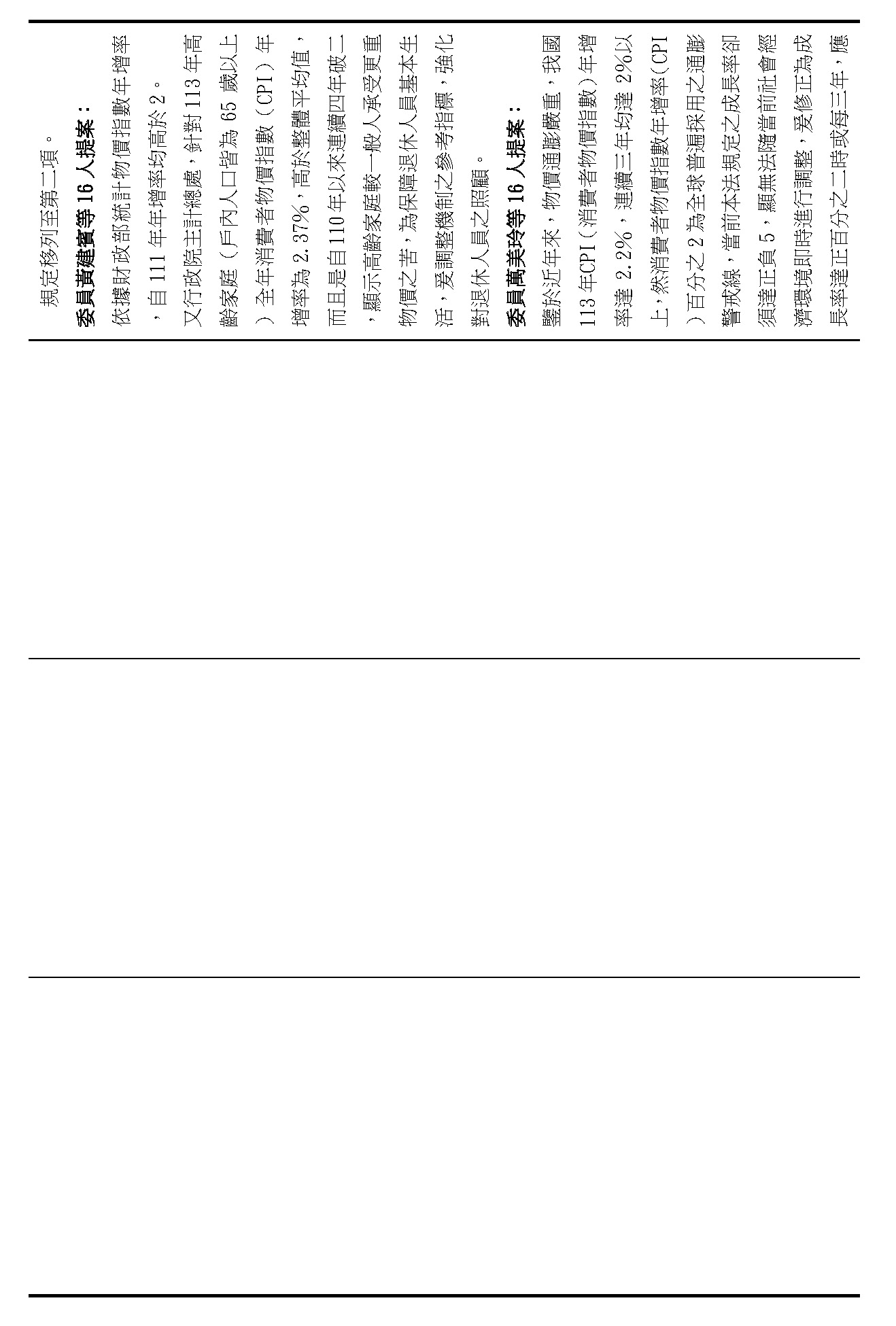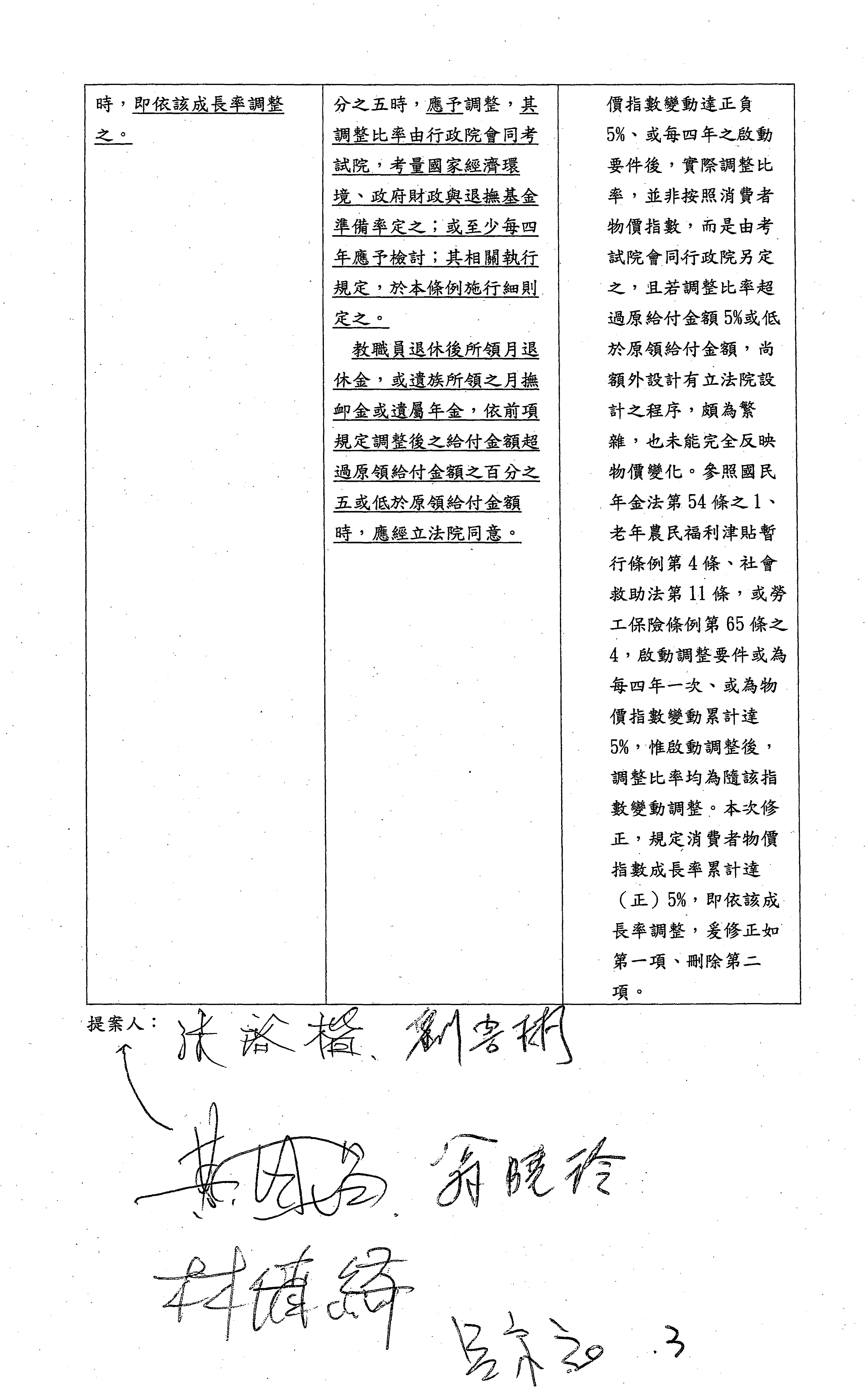 陳委員培瑜:謝謝。我想還是針對逐條來發言,所以針對第六十七條的部分,我要請教在野黨委員,我真的很仔細看了各個委員的版本,因為確實在第六十七條看起來,很多委員對於CPI的調整還有相關數字其實是不滿意的。你們認為現在的版本是不夠好的,但是我要先提醒,目前的版本,正負百分之五或者是四年調整一次,確實也是穩定相關退撫基金可以健全的發展往下去看,但是你們現在的改法讓我覺得非常疑惑,包含有一個委員的版本非常有趣,他的寫法是這樣寫的,他寫了一個「或」字,他說「發布日起三個月內予以調整,其調整比例由行政院會同考試院制定公式定之;或隨軍公教加薪比例調整」。我不知道這個委員的辦公室在想像這個「或」字放在法律條文裡面,到底是要我們行政機關怎麼做事?這個是我覺得如果逐條討論,這些委員的版本,我真的不知道後續的調整該怎麼做。還有委員談到正百分之三的時候,就要予以調整,或至少每四年予以檢討。我還是看不懂這個「或」的寫法,到底是要行政機關怎麼做?當然現在相關的調整其實就是四年要檢討,還有正負百分之五都要檢討,這個數字本來就是已經在法律裡面,而且確實已經這麼做了,在過去幾年當中,我們的調整已經來到百分之六,所以要拜託在野黨的委員要看到這個數字,還是希望可以維持原案,不要真的做修法的調整。