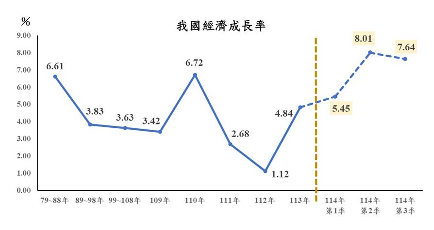 110年經濟成長達6.72%,企業獲利及稅收均表現亮眼。111、112年間雖因全球產業鏈庫存調整而成長放緩,但隨即在人工智慧(AI)、高速運算等新興需求加速擴大帶動下,憑藉近年國內產業供應鏈更加壯大完整之優勢,113年經濟成長率回升至4.84%。今(114)年雖美國關稅措施增添全球經貿不確定性,我國前3季經濟成長率在高基數下仍分別成長5.45%、8.01%及7.64%,顯示近年我國隨製造產能不斷擴增,經濟體質更具韌性,將有助財政穩健及政府施政,惟對非AI相關產業表現不佳的不均衡發展現象須多加關注與因應。