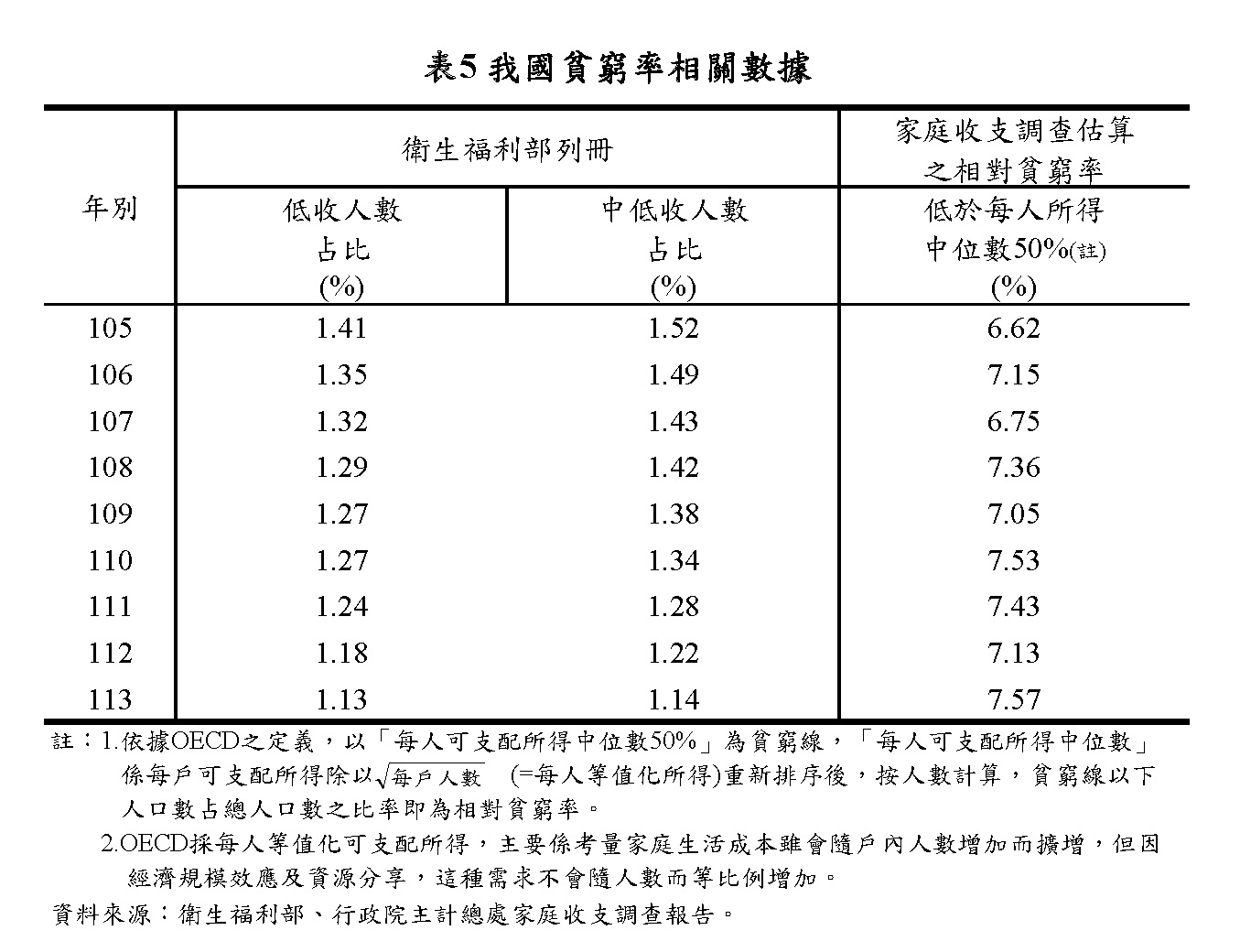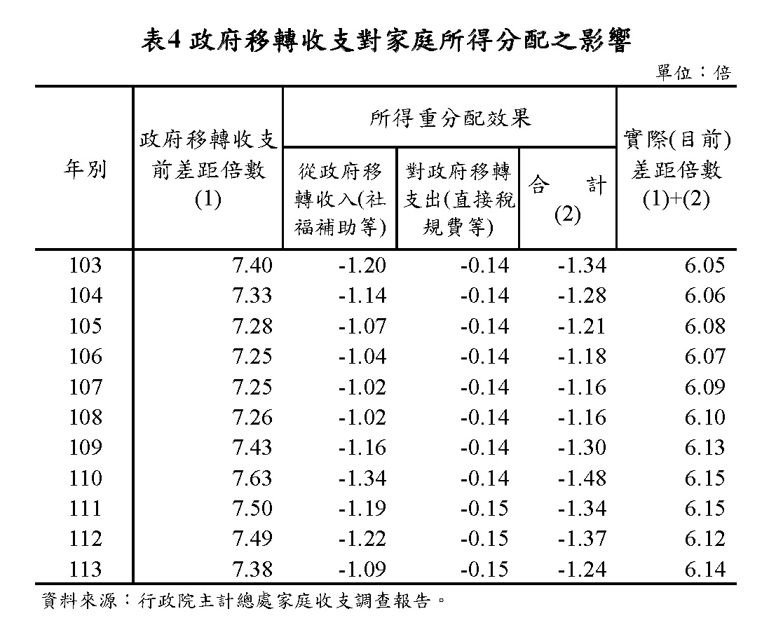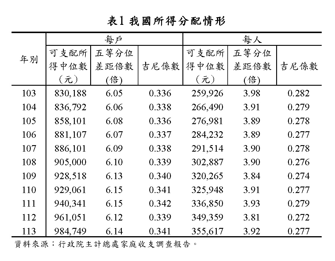 (一)國際間在觀察所得分配時,主要係透過家戶面的所得抽樣調查,並多以可支配所得之吉尼係數作為衡量全體家庭間所得不均程度指標,或以所得占比表達整體分配情形。另為瞭解高、低所得家庭差距概況,再輔以五等分位差距倍數來觀察。
