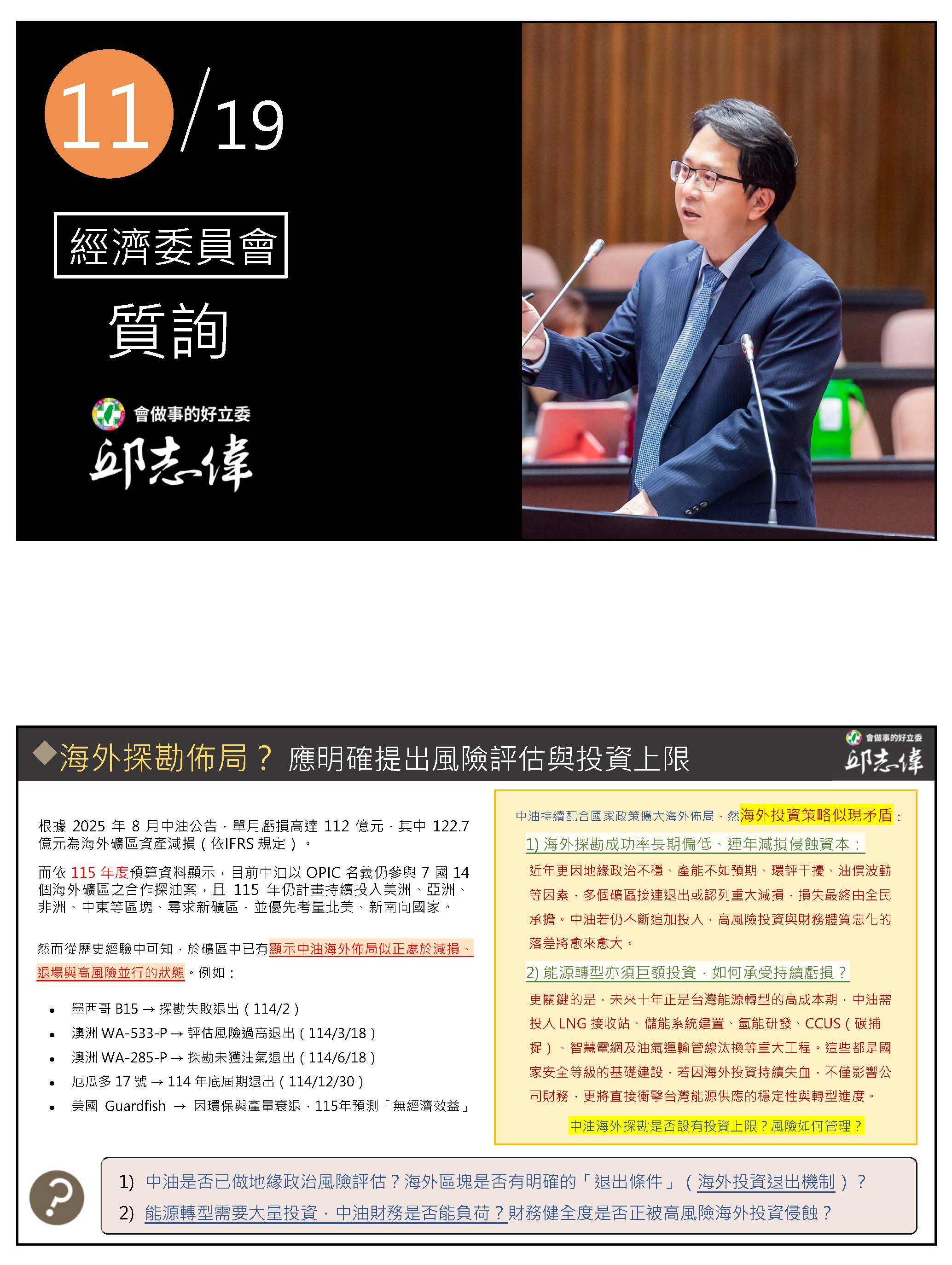 根據媒體11月4日報導:2012年,有加油站站長與兩名男子組成竊油集團,從加油站對面廠房偷挖中油油管行竊未遂,雖被查獲但僅判刑3月得易科罰金。然中油直到2024年8月才提起求償訴訟,法院認為已超過10年期間,超過請求權時效,判中油敗訴。請問部長,中油作為國營事業,竟能讓竊油案從2012年拖到2024年才想到要求償,最終敗訴收場,顯示內控與法務系統嚴重失能,經濟部是否要求中油檢討其法律追償作業時程與內部風險稽核機制,避免國營事業淪為偷油集團提款機的狀況再次發生?