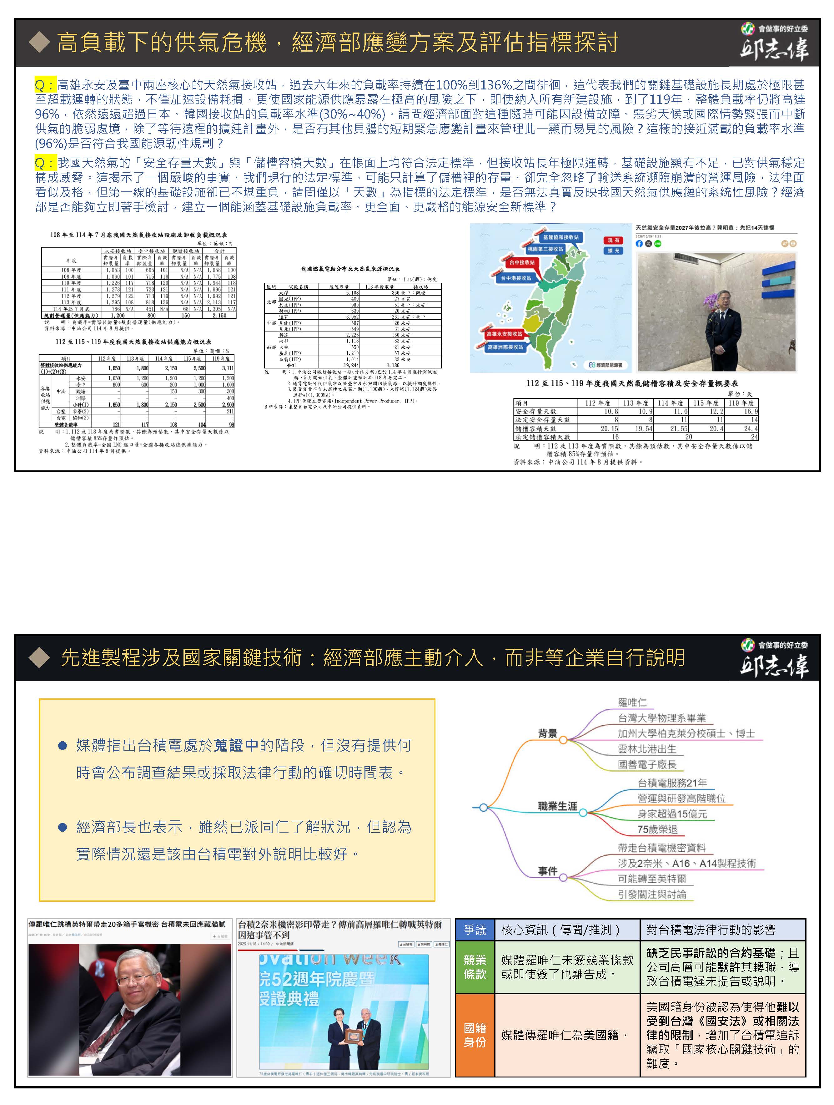 王委員鴻薇:部長好。今天我們經濟委員會安排的是針對中油三接的二期工程有沒有弊案來做專案報告,不過我想我今天可能還要請教一下,我覺得這個事件國內外都非常的震驚,就是我們的台積電再次發生包含技術機密跟營業機密可能被竊的事情。剛才我在司法及法制委員會詢問法務部部長,因為根據媒體報導,我不曉得部長了解的情況是怎樣,就是台積電正在了解,還沒有要告發,但是法務部高檢署已經主動要調查這個案子,已經主動分案,按照違反營業秘密法還有國安法去主動偵辦。那我非常肯定,我非常肯定,因為我們的護國神山,而且是2奈米以下的這些技術有可能被竊,茲事體大。那我另外請教一下部長,因為這位羅唯仁副總,他後來在9月份,也榮任我們工研院院士,對不對?
